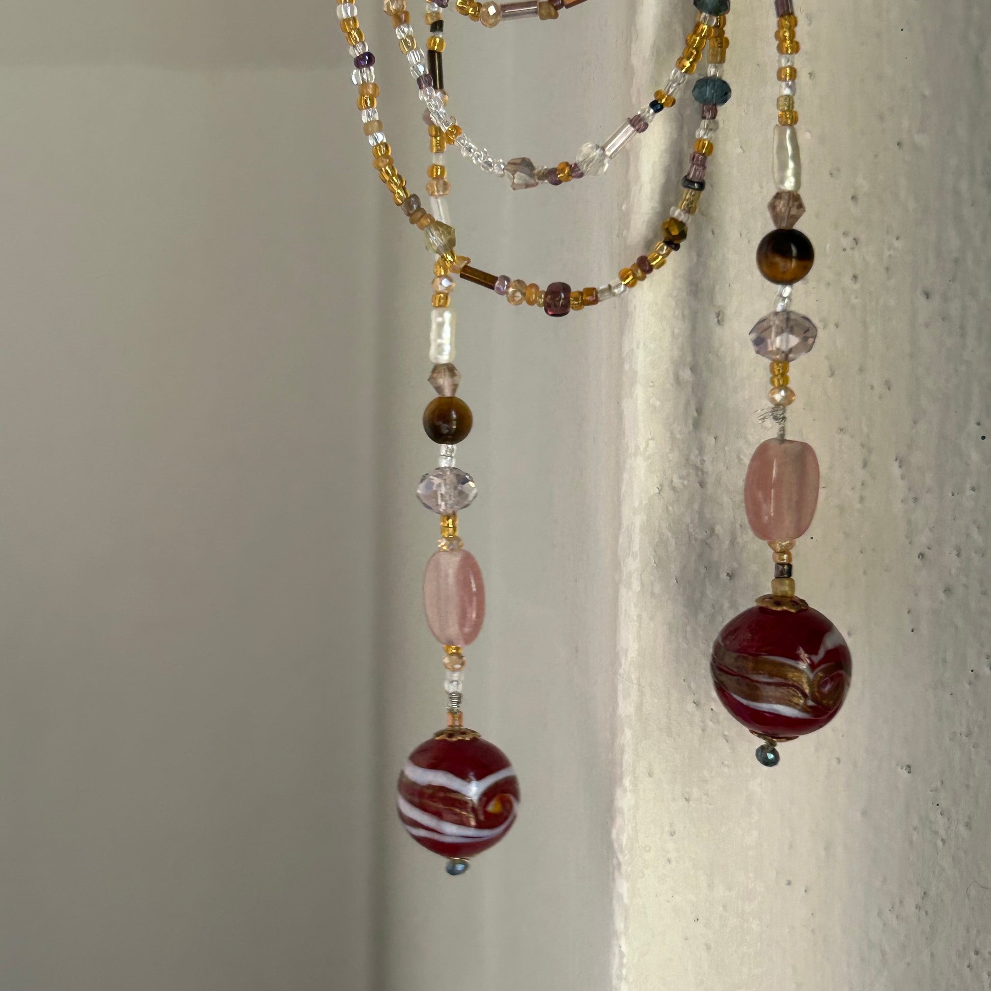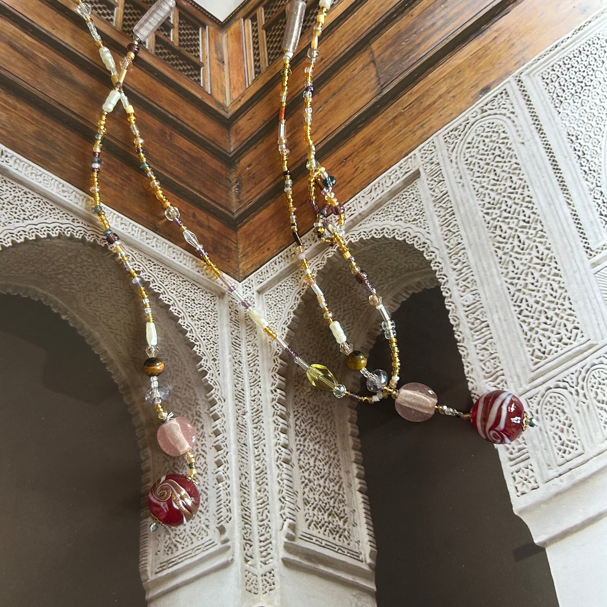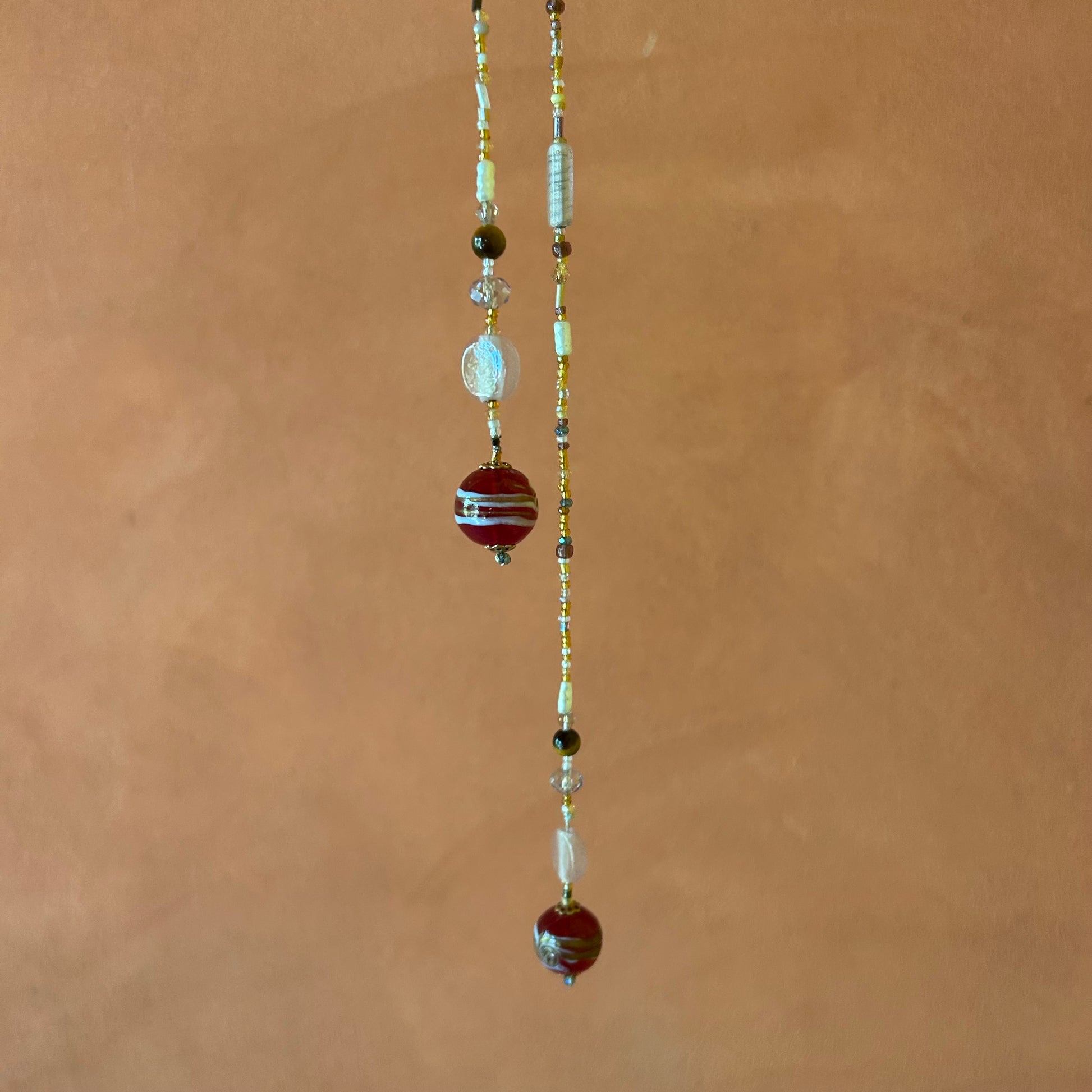 Collana aperta realizzata a mano con perle di diversi materiali tra cui vetro e pietre dure.
