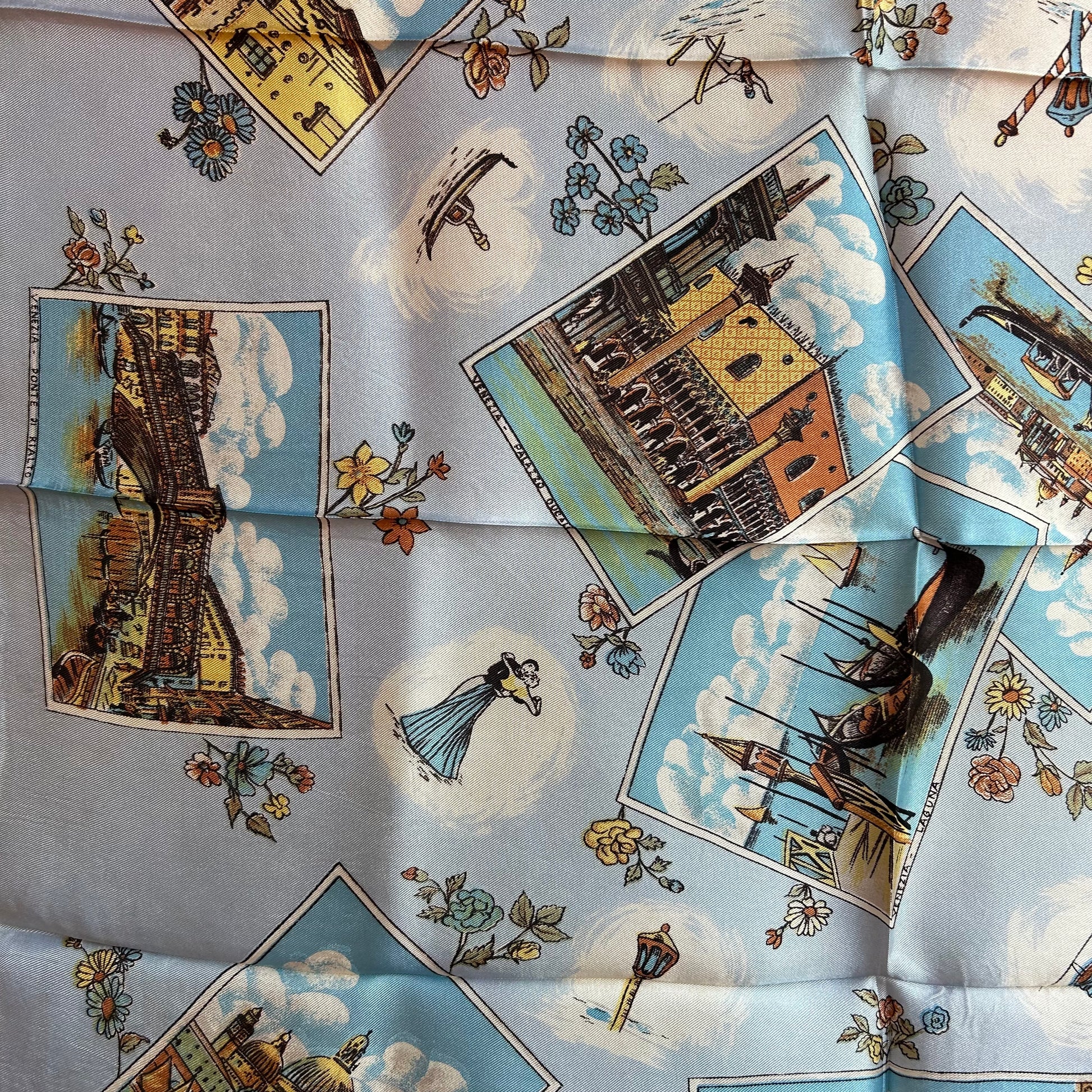 Foulard commemorativo della città di Venezia. Il materiale non è specificato, probabilmente si tratta di raso sintetico. Presenta segni del tempo (piccoli buchi visibili in foto).