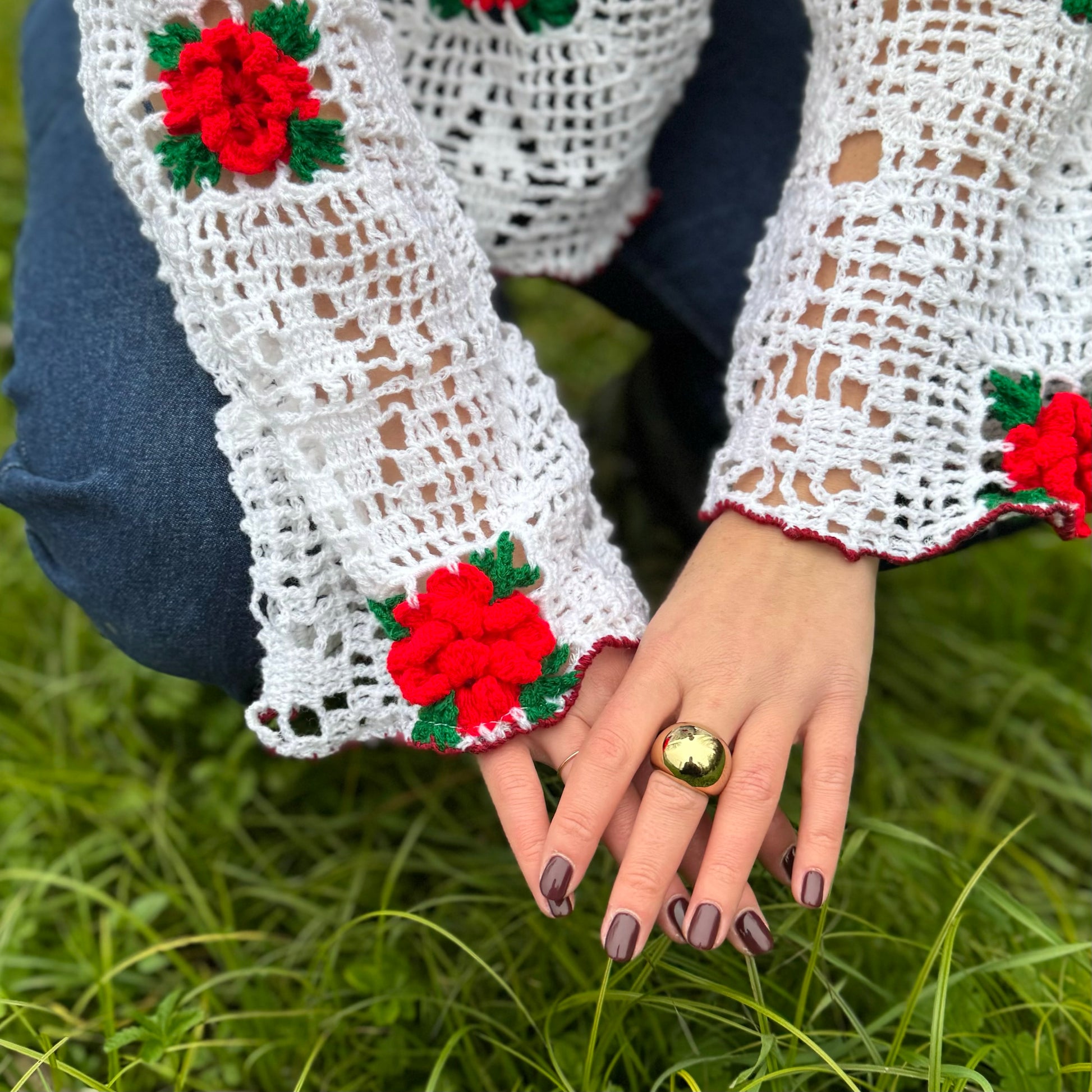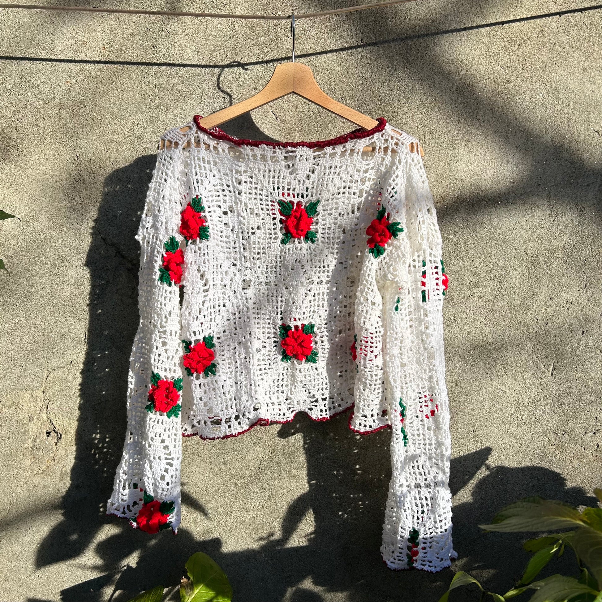 Maglione con rose tridimensionali in misto lana. Il maglione è stato ricavato da una coperta vintage realizzata a mano. Veste da una S ad una L. Presenta dei normali difetti di una capo realizzato a mano.