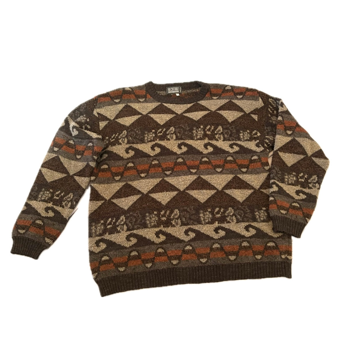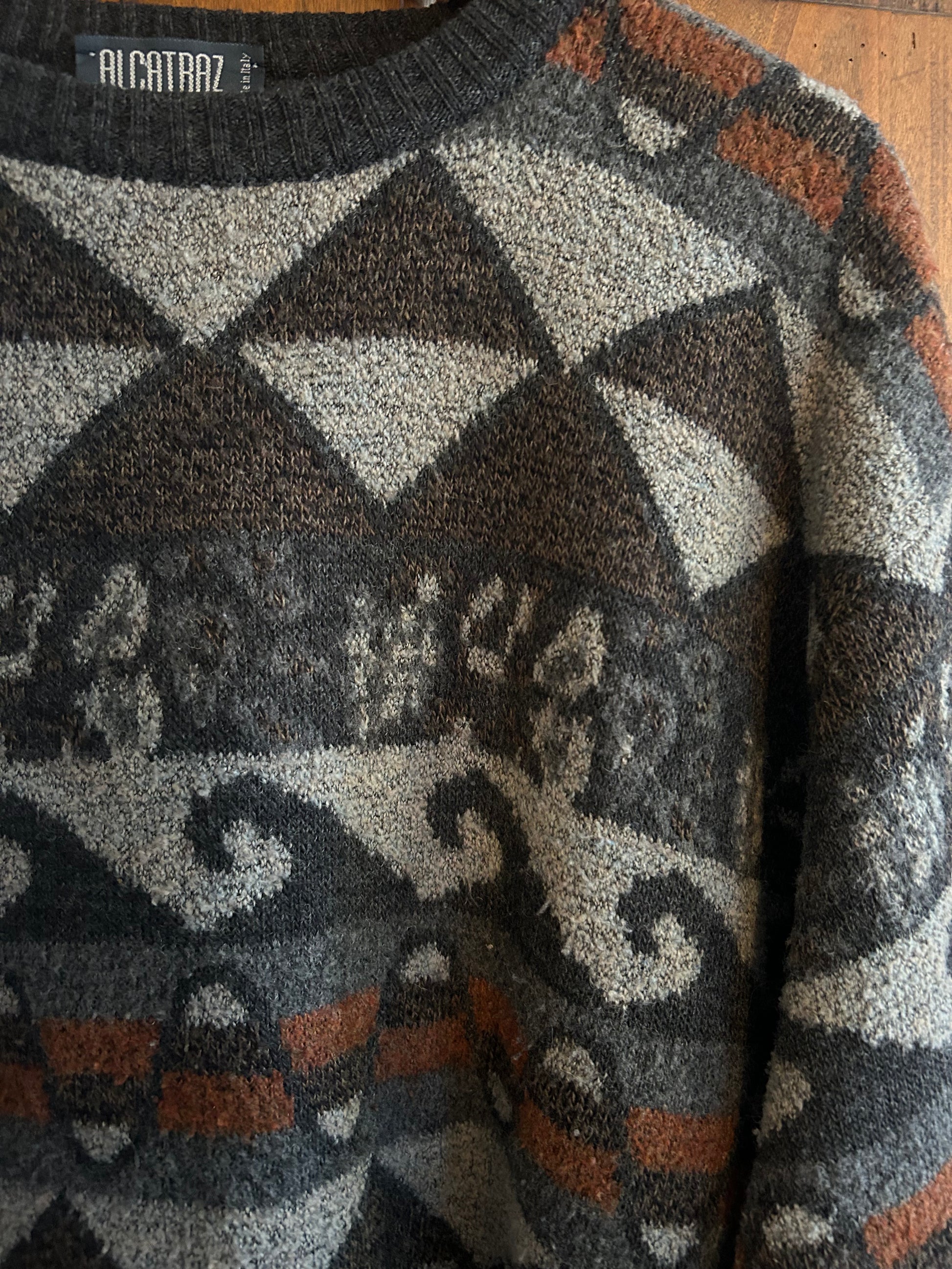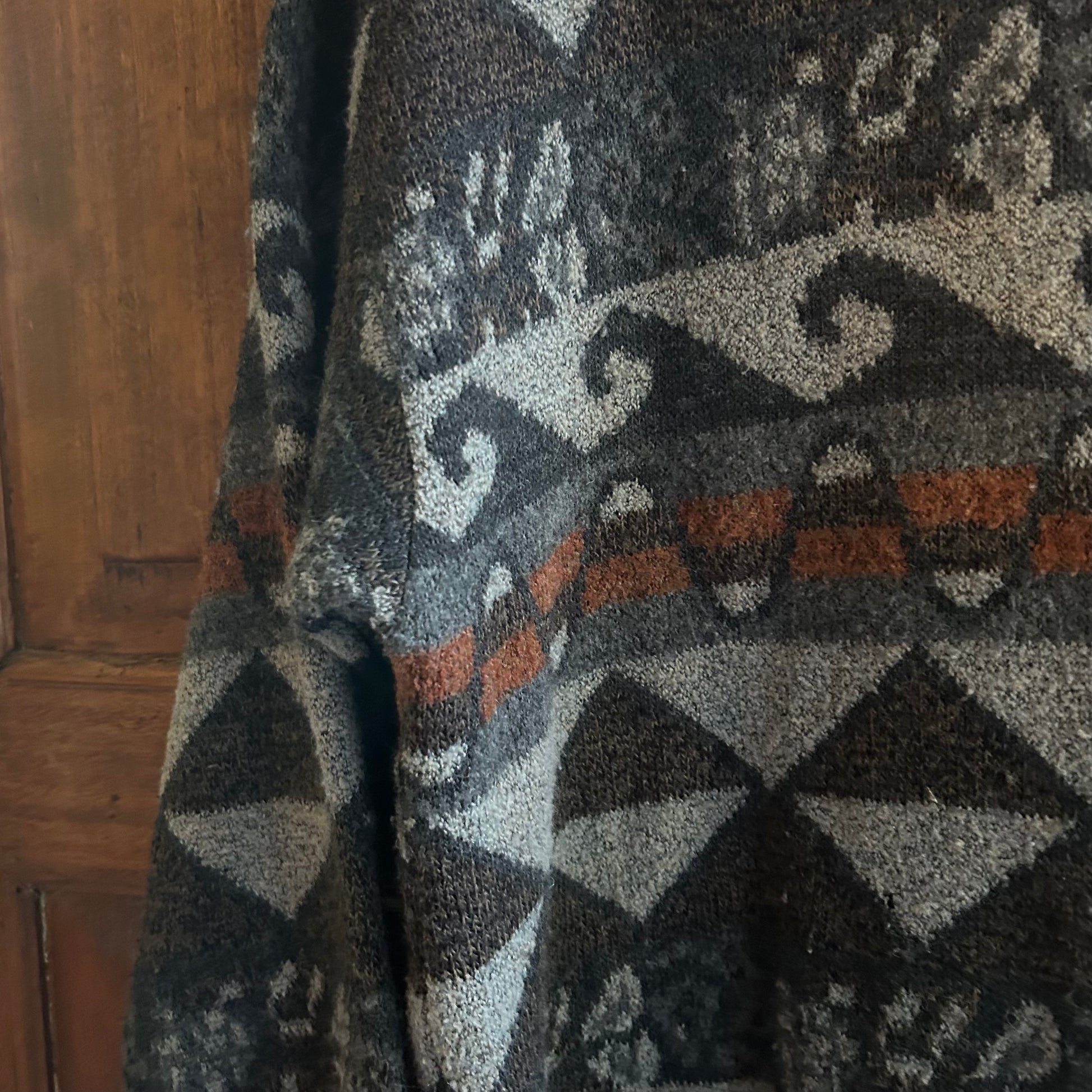 Maglione a fantasia geometrica dai toni scuri e “terrosi”. La composizione è 35% lana, 6% mohair, 4% viscosa, 5% nylon, 50% acrilico.