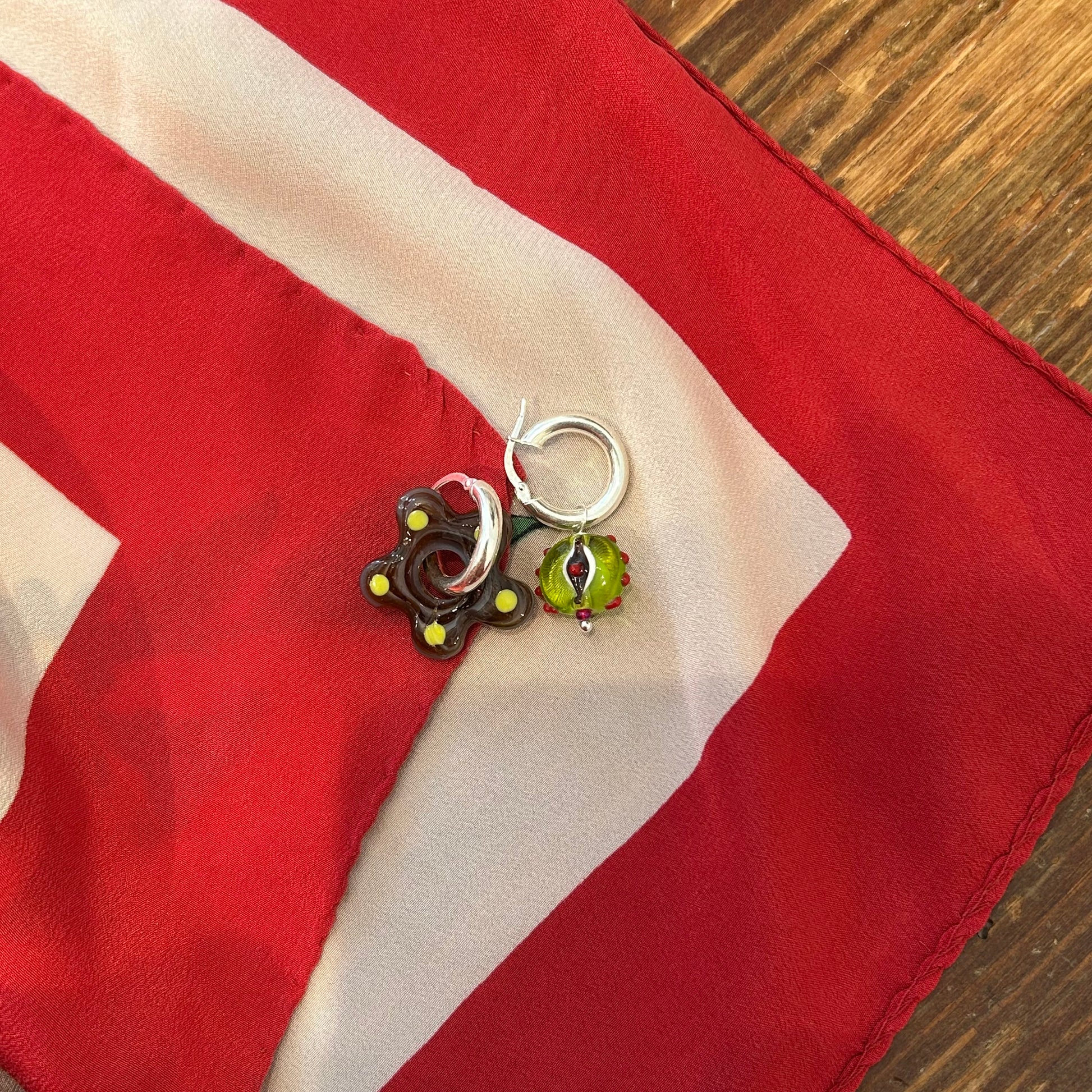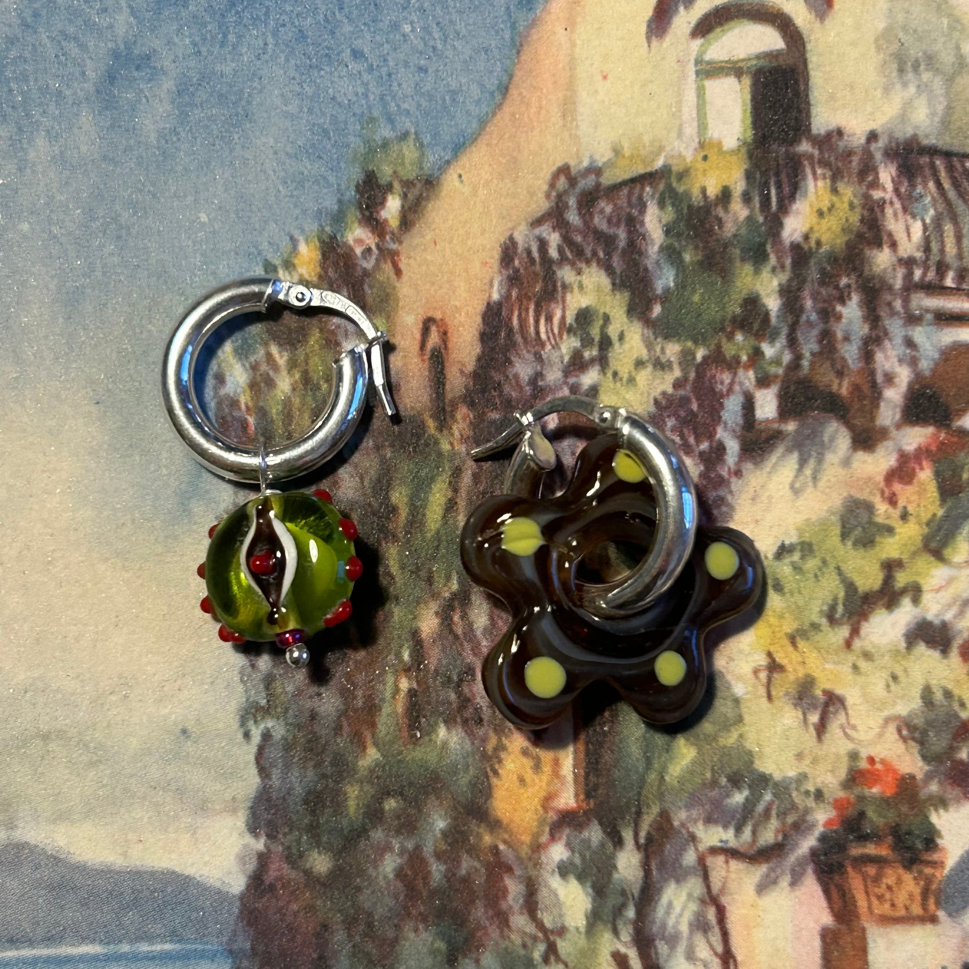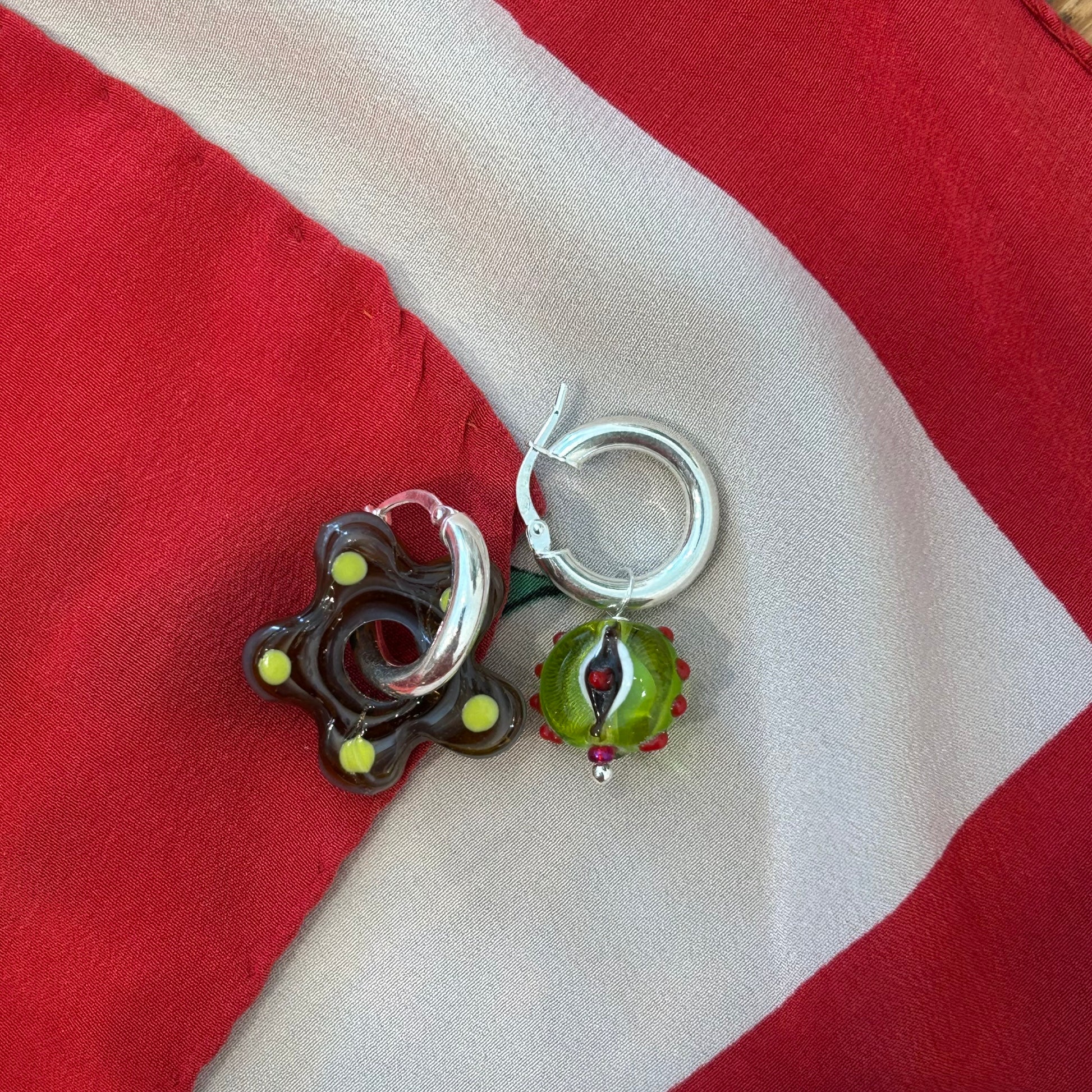 Orecchini a cerchio con pendenti realizzati a mano. La base è in argento 925, i ciondoli sono realizzati con materiali di recupero. Si tratta di pezzi unici. Non vanno esposti ad agenti chimici o acqua.