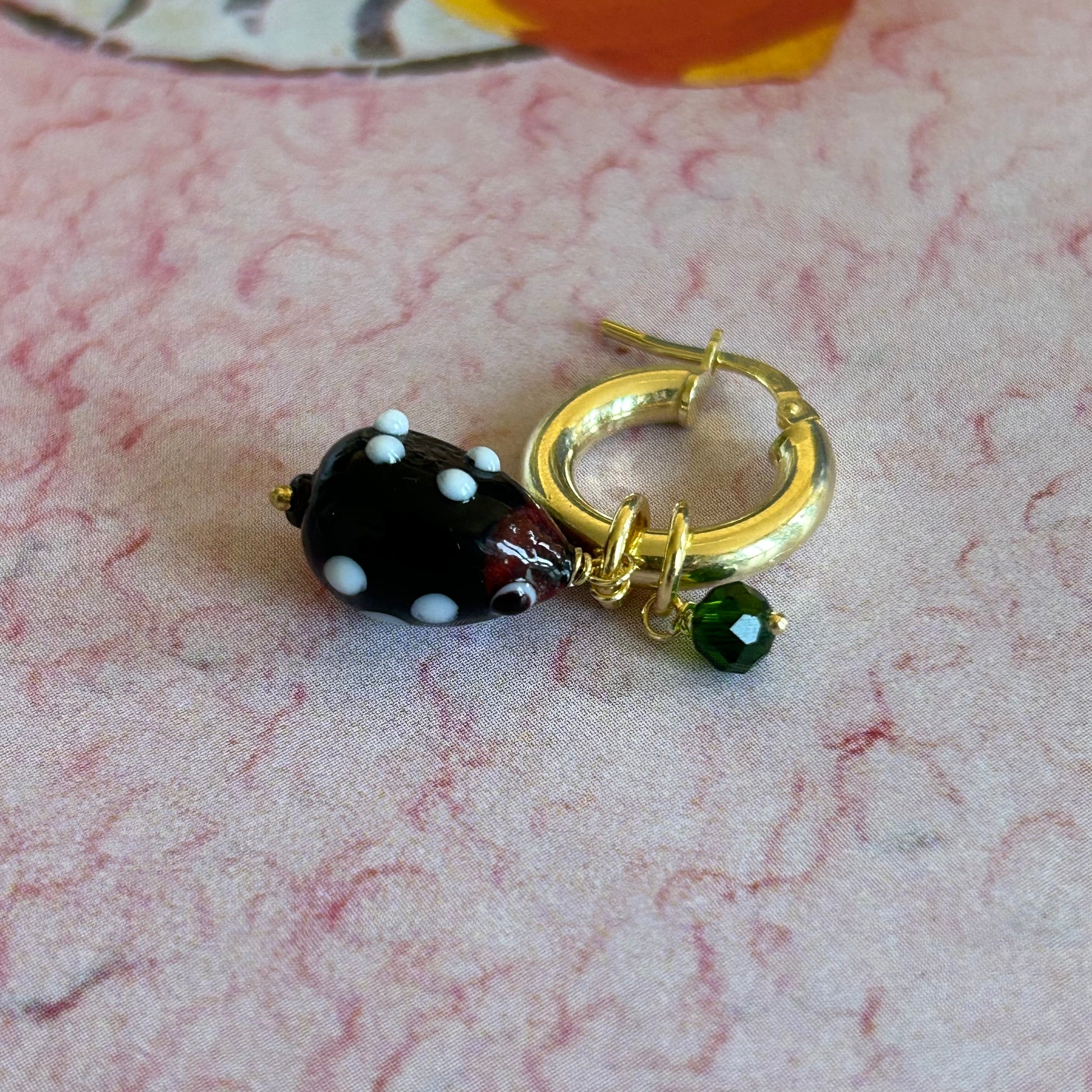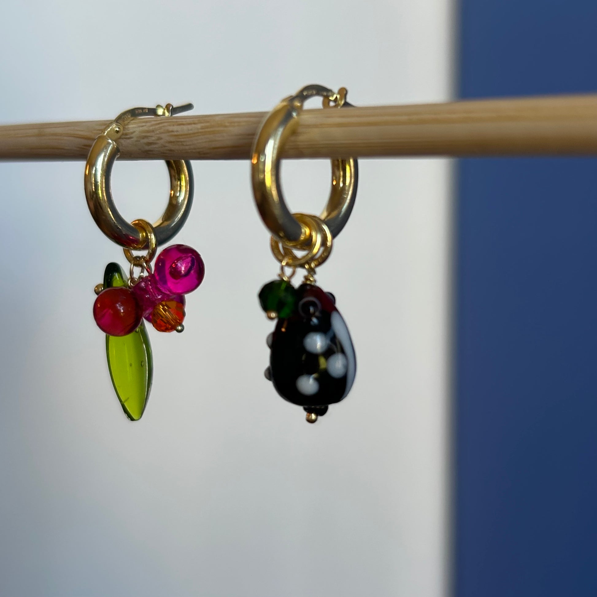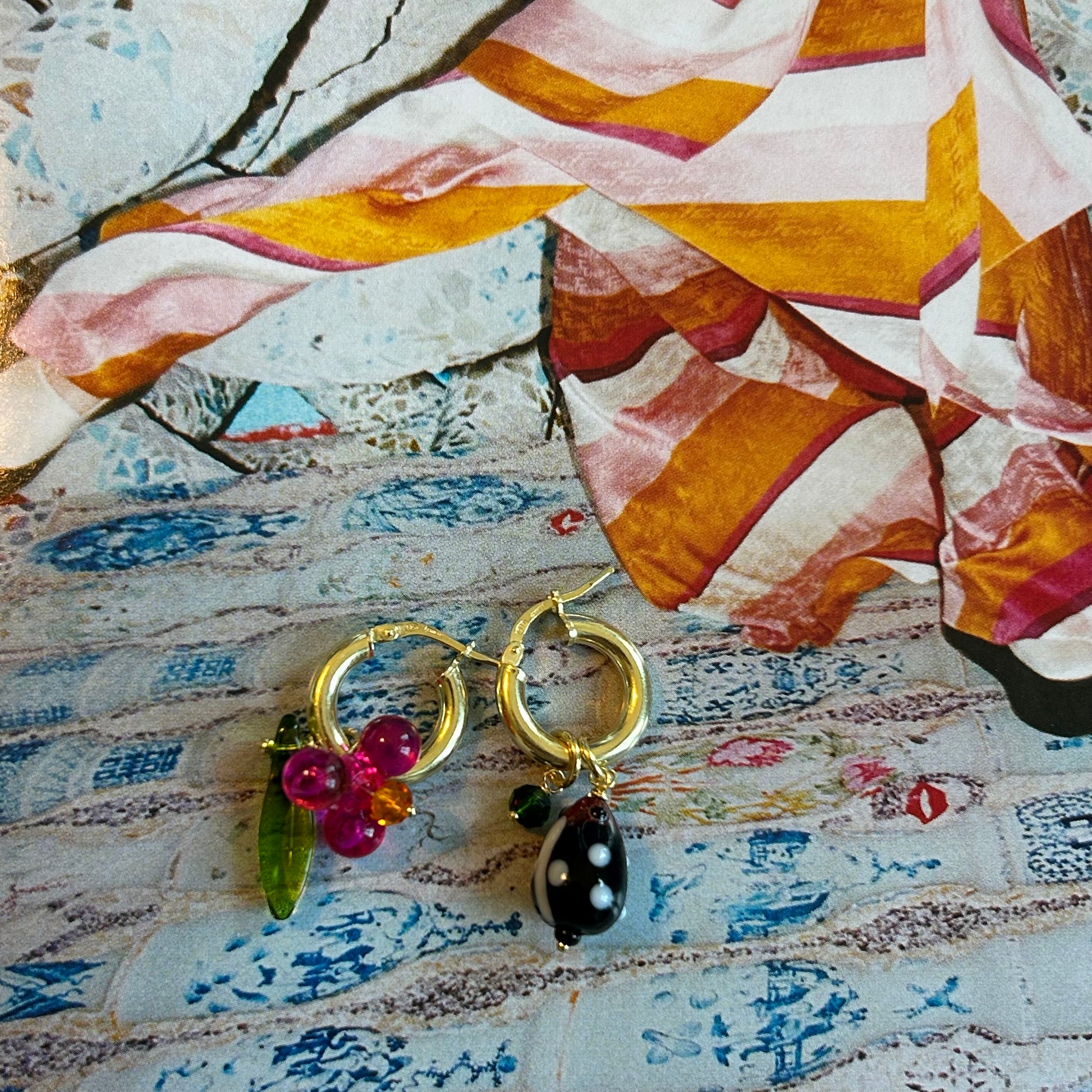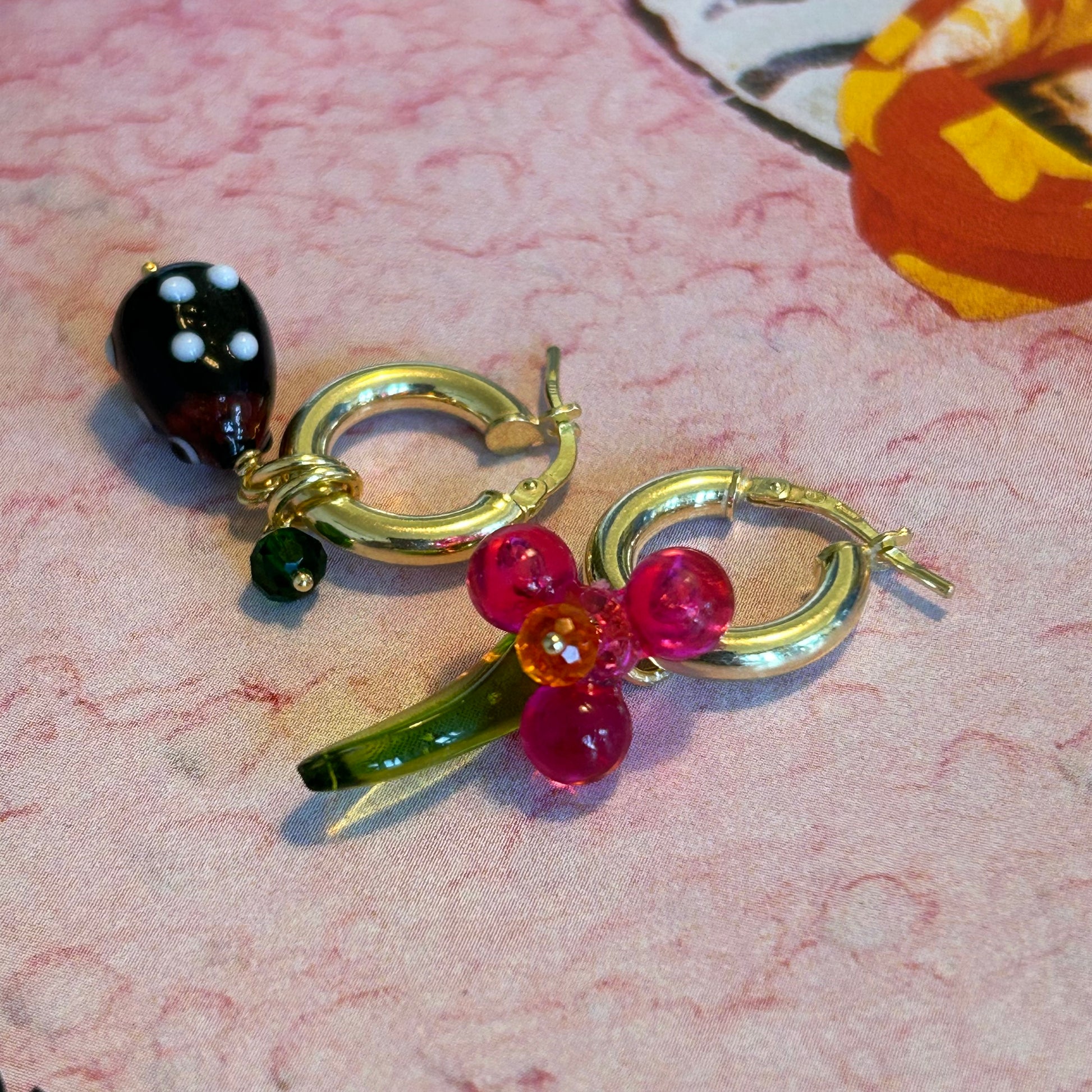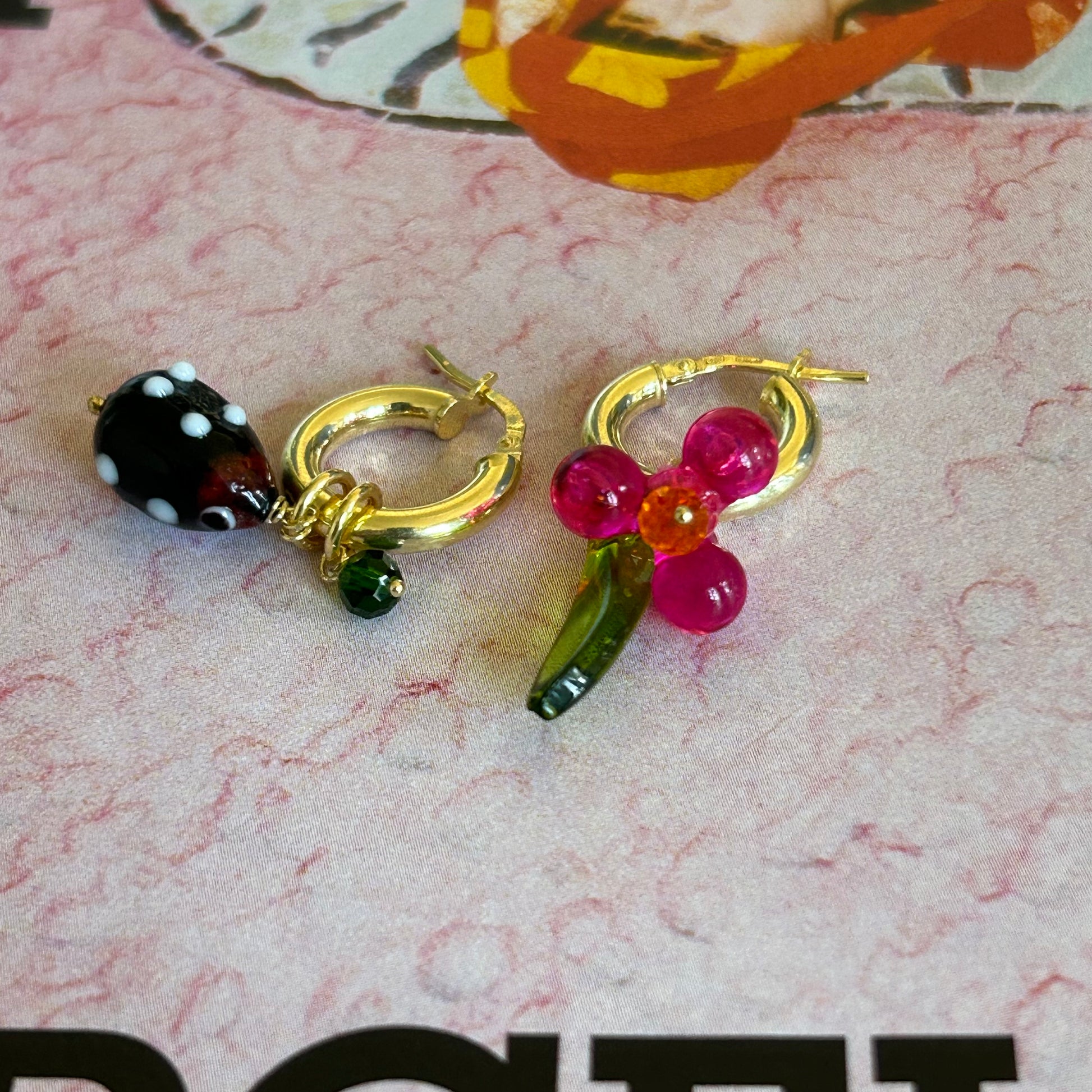 Orecchini a cerchio con pendenti realizzati a mano. La base è in argento 925 rodiata gialla, i ciondoli sono realizzati a mano con perline in vetro. Si tratta di pezzi unici. Non vanno esposti ad agenti chimici o acqua.