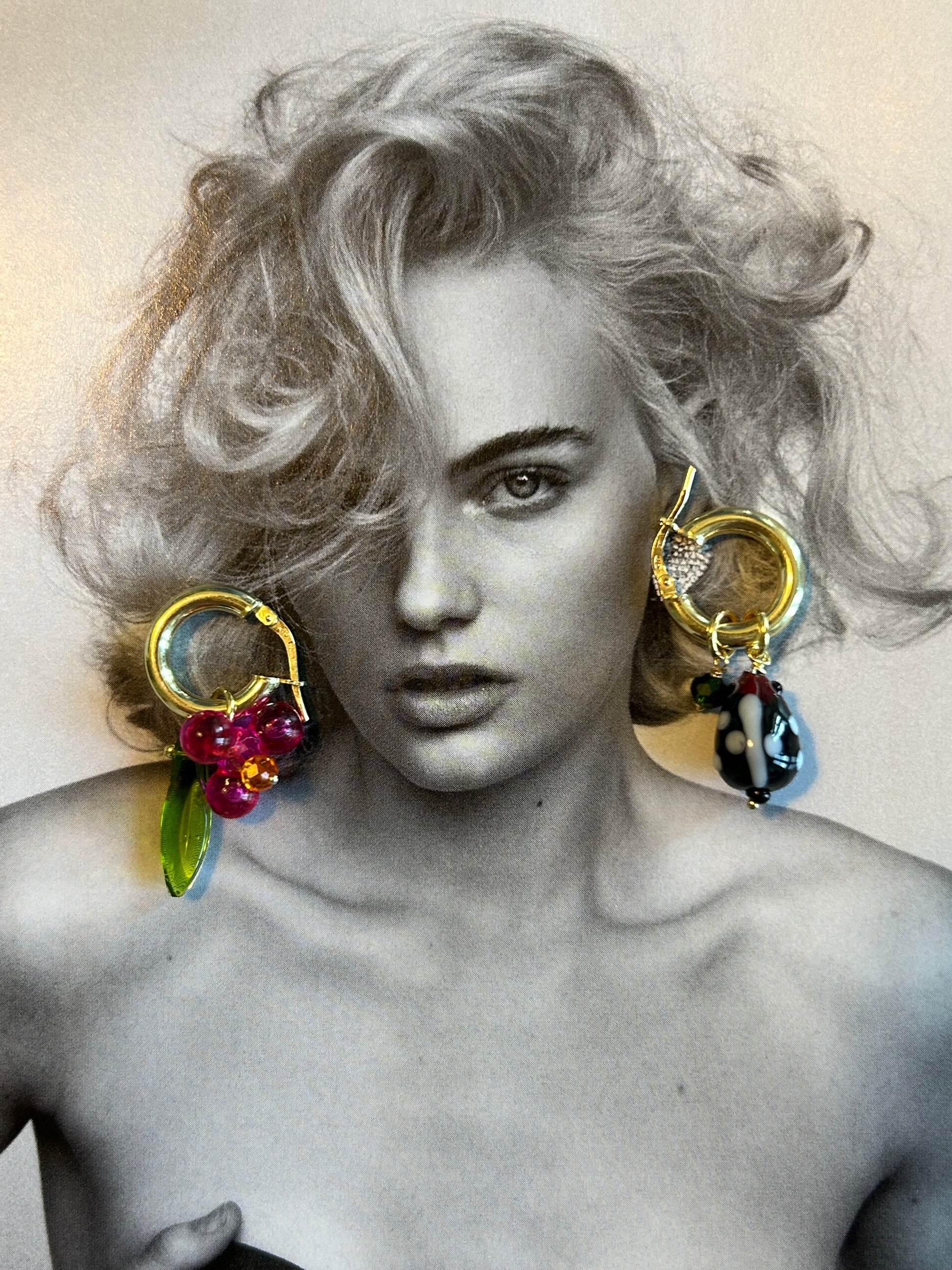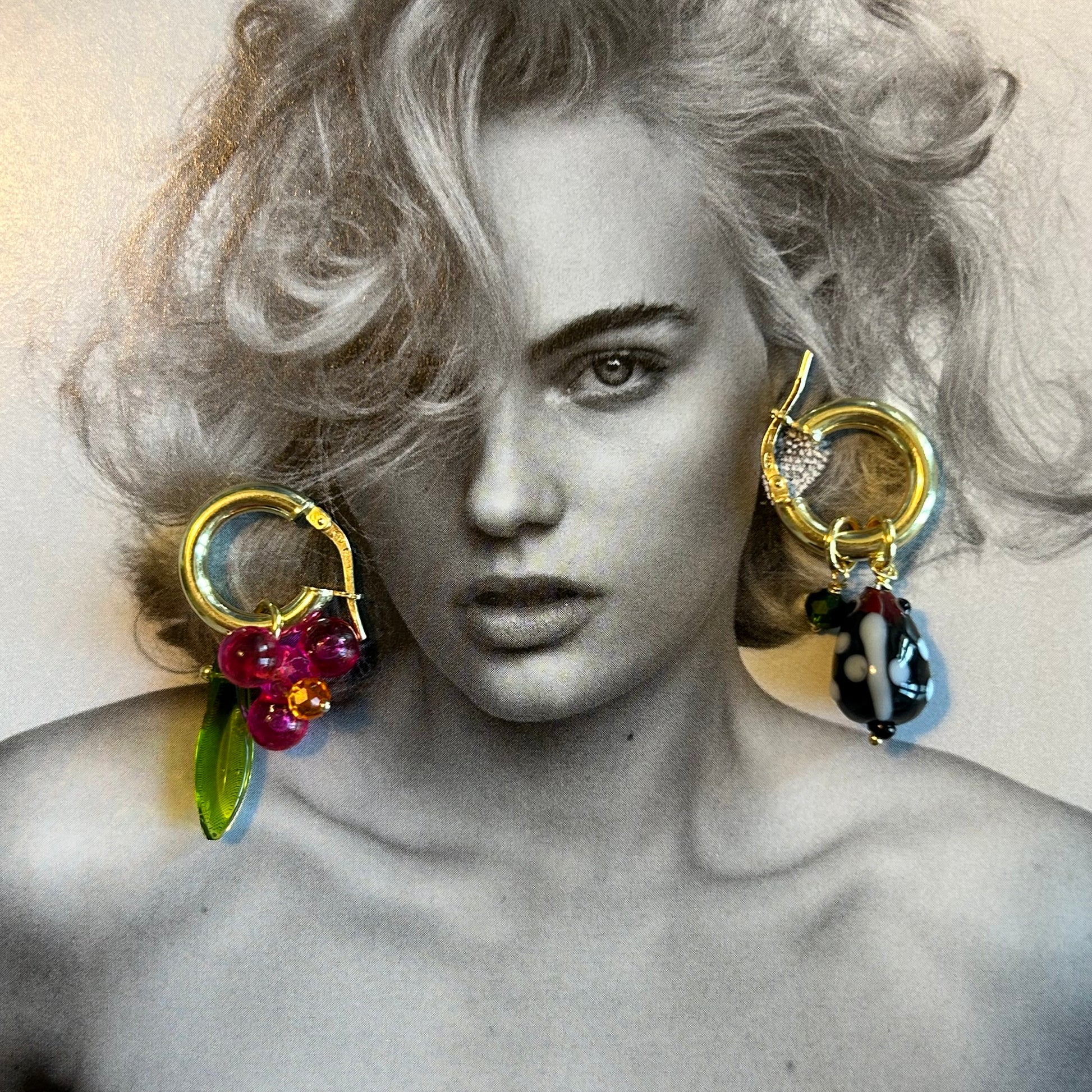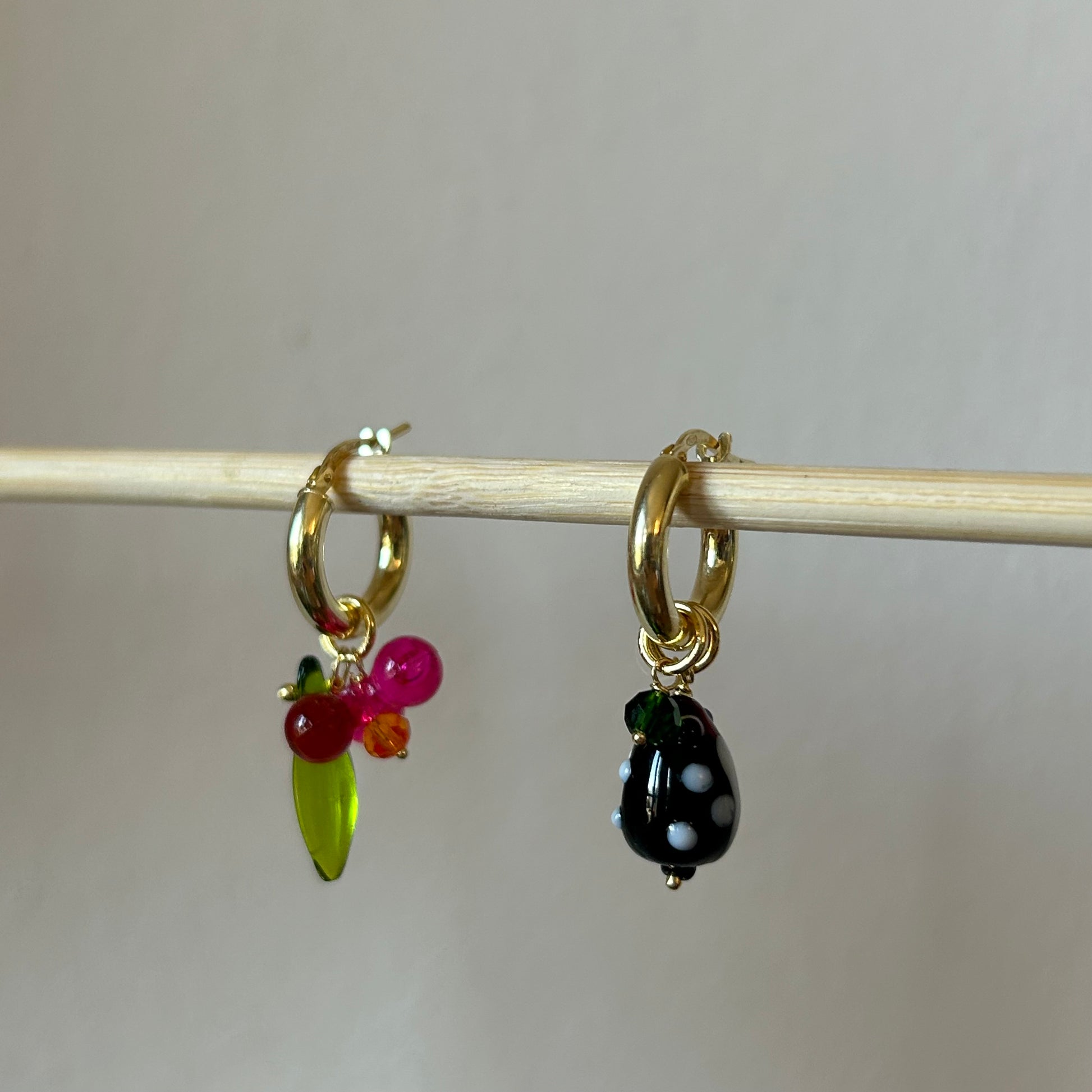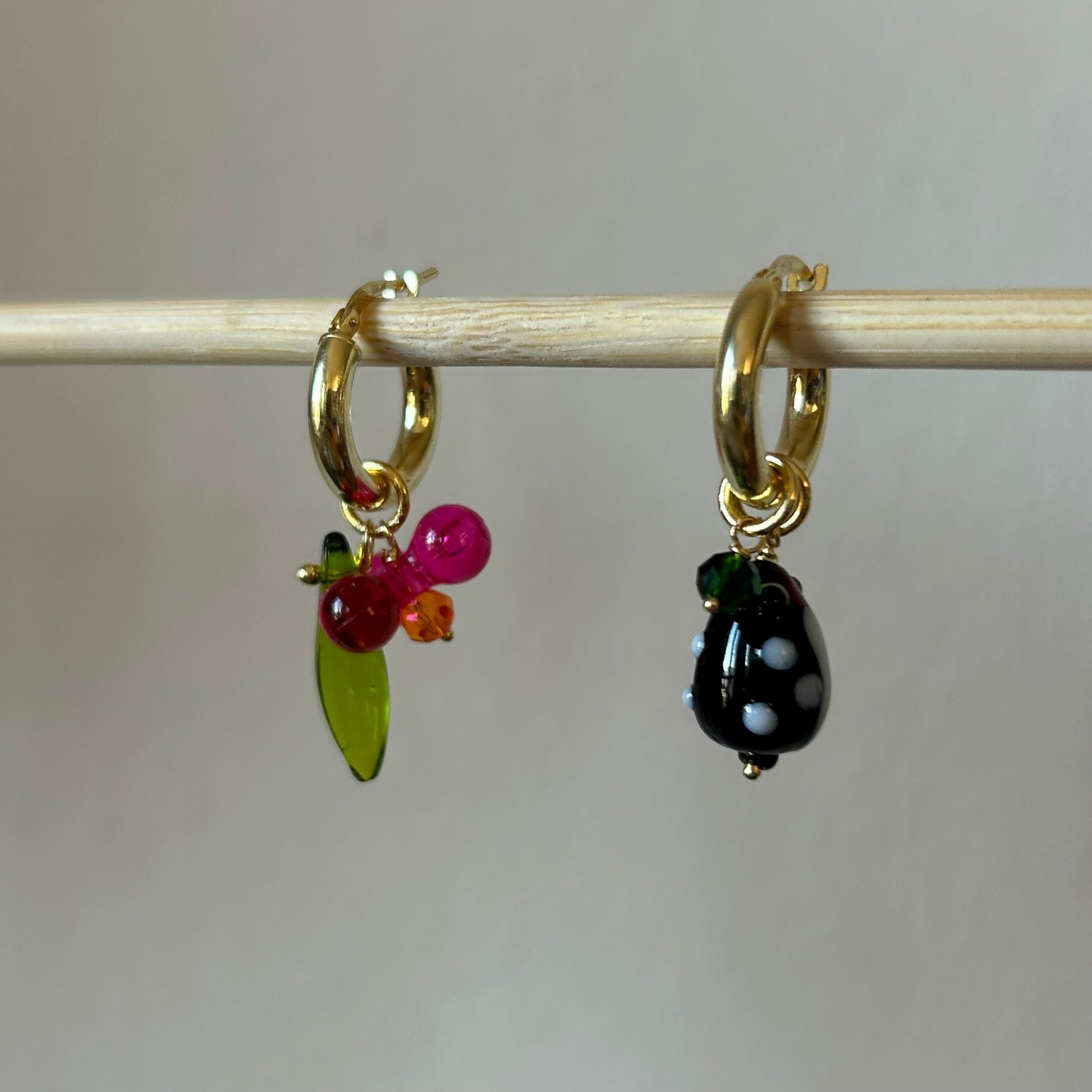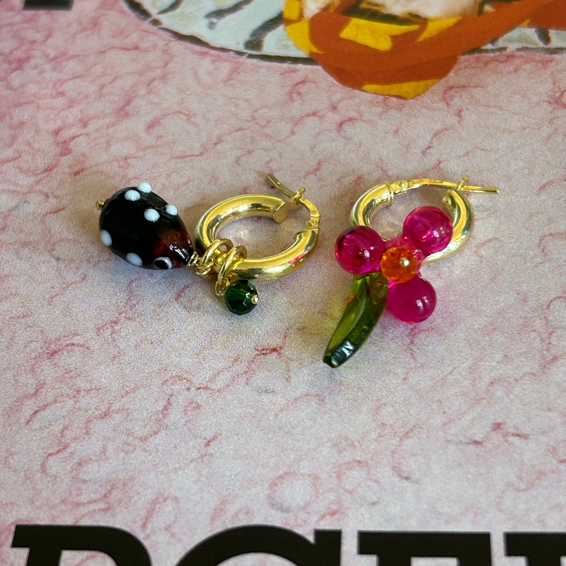 Orecchini a cerchio con pendenti realizzati a mano. La base è in argento 925 rodiata gialla, i ciondoli sono realizzati a mano con perline in vetro. Si tratta di pezzi unici. Non vanno esposti ad agenti chimici o acqua.