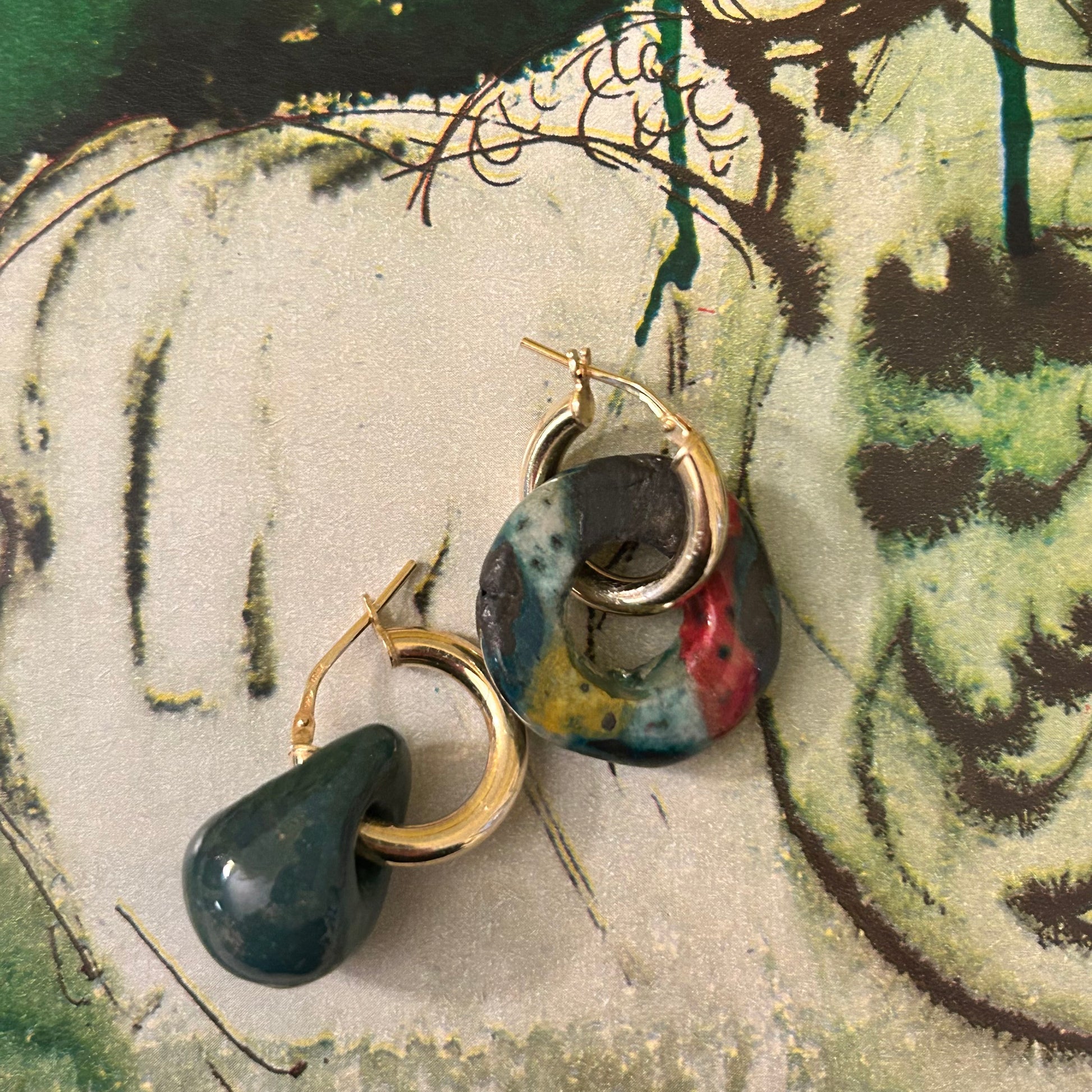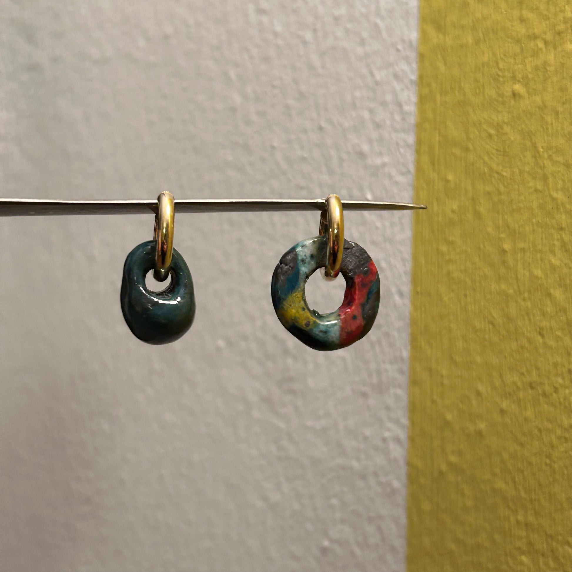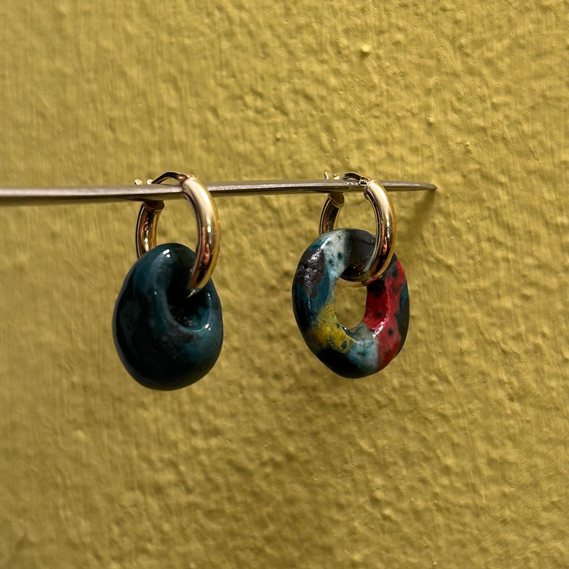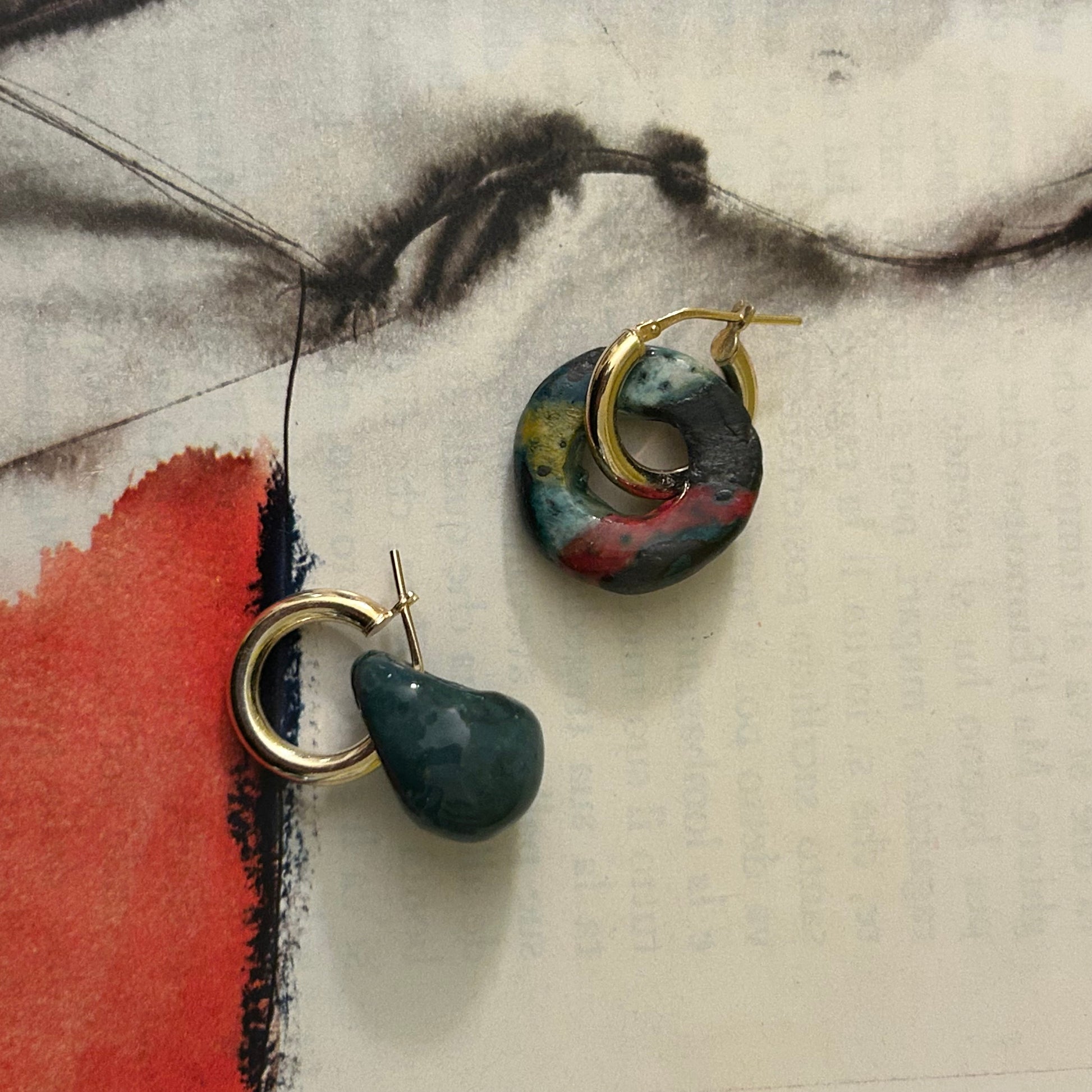 Orecchini a cerchio rodiato giallo, con pendenti realizzati a mano. I ciondoli sono in ceramica. Si tratta di pezzi unici. Non vanno esposti ad agenti chimici o acqua.