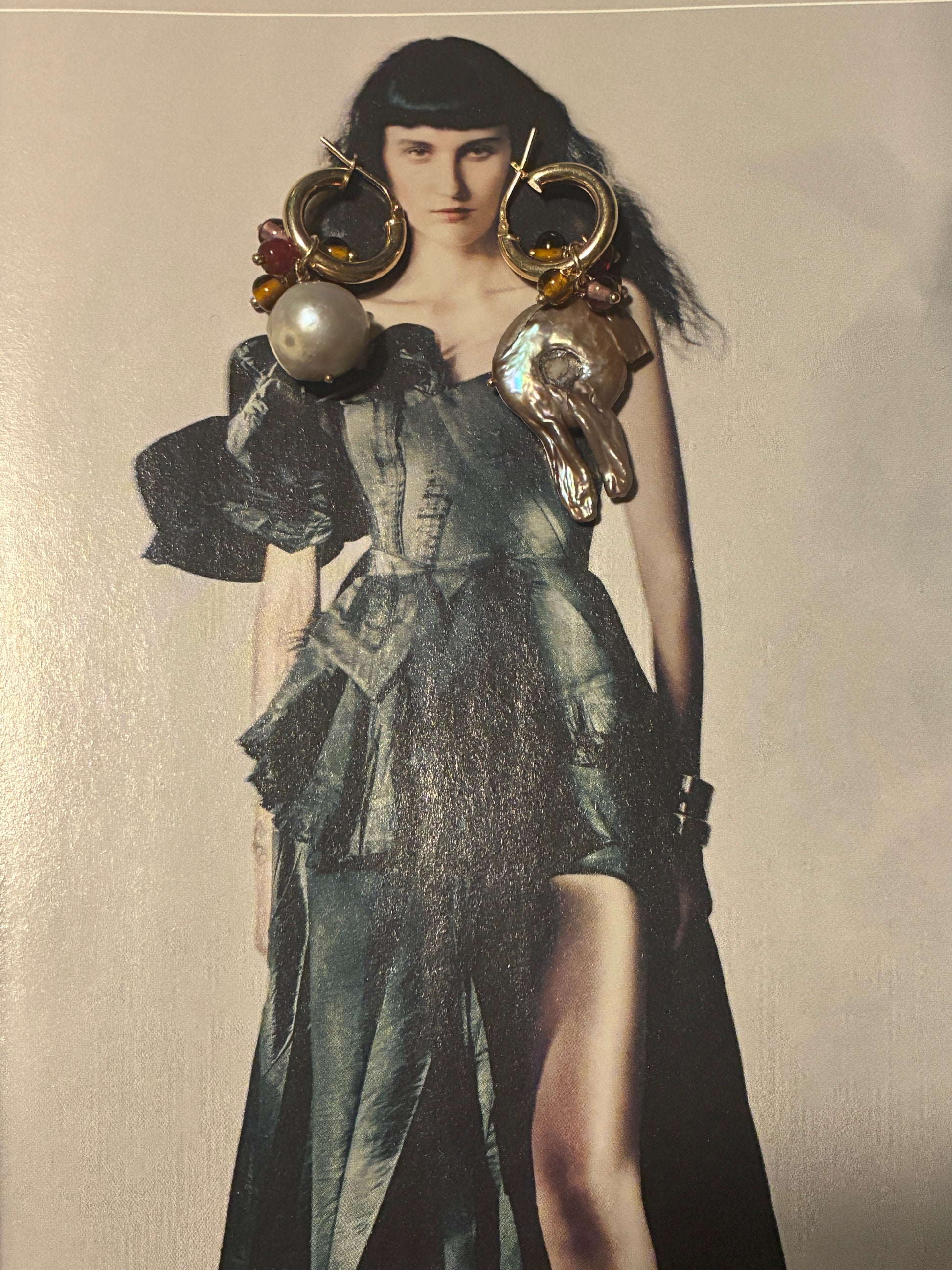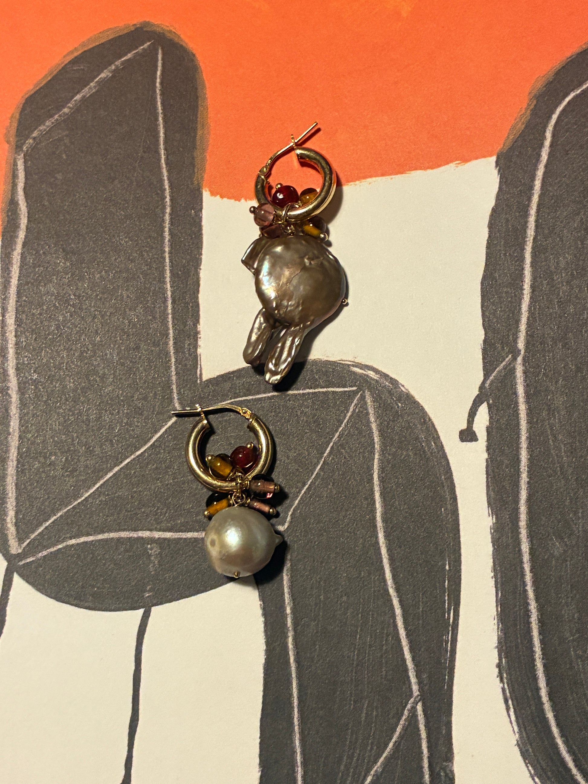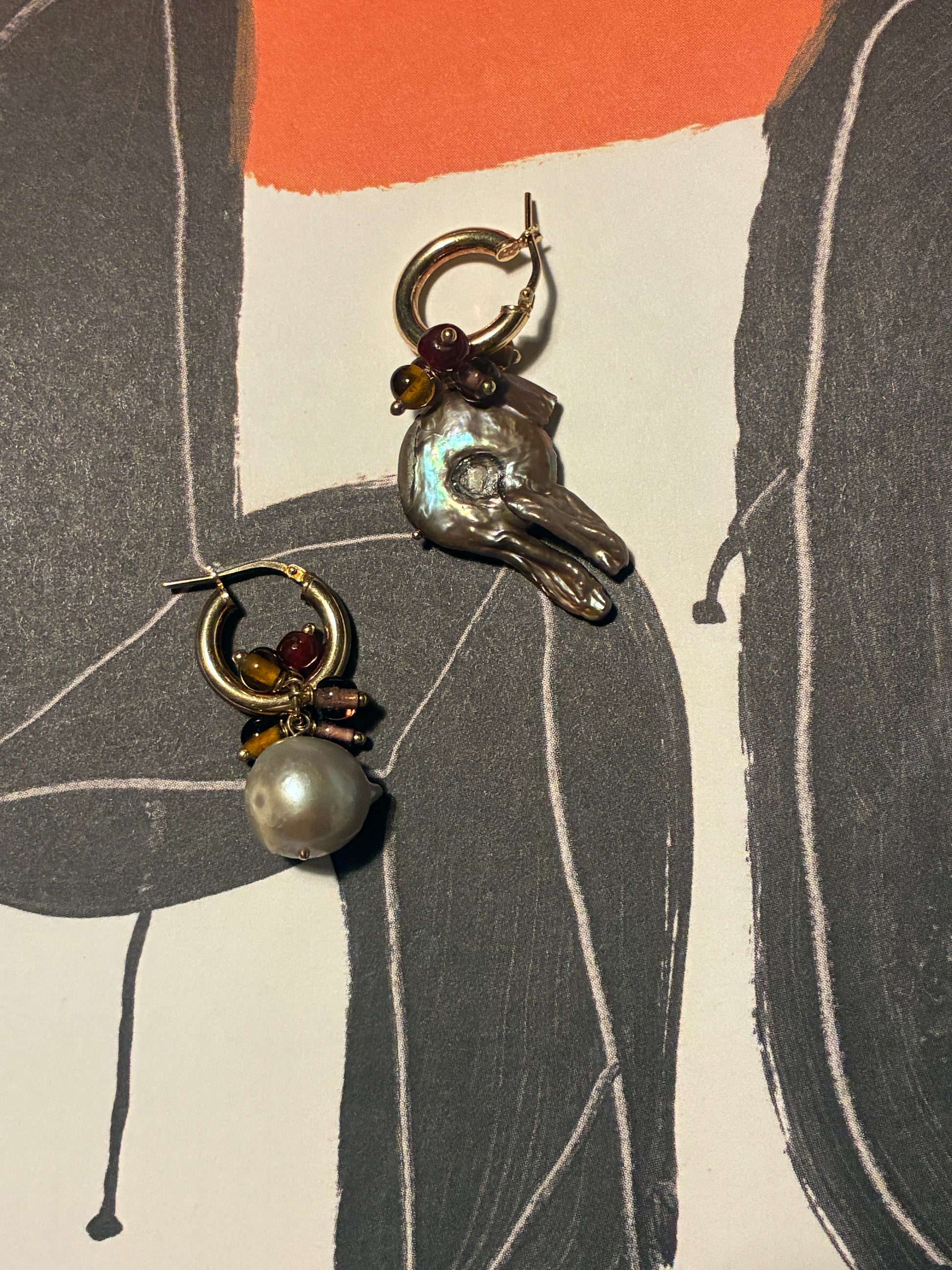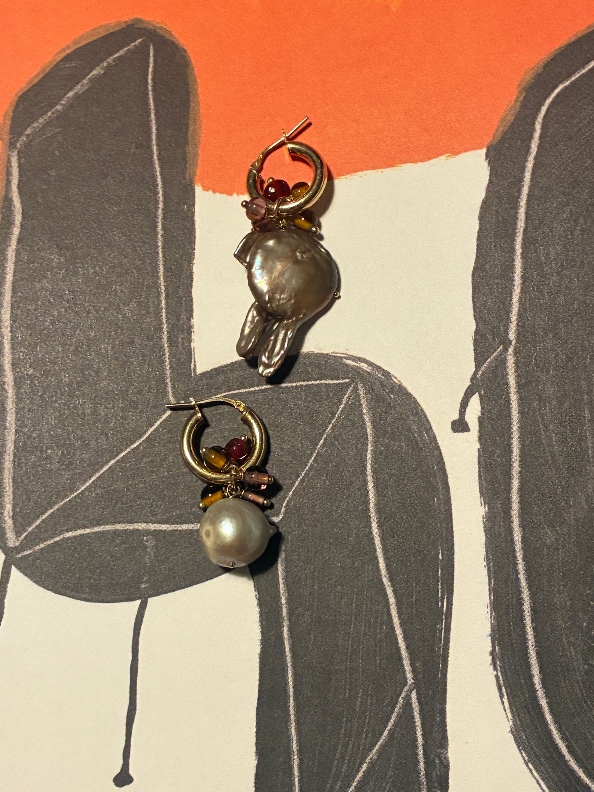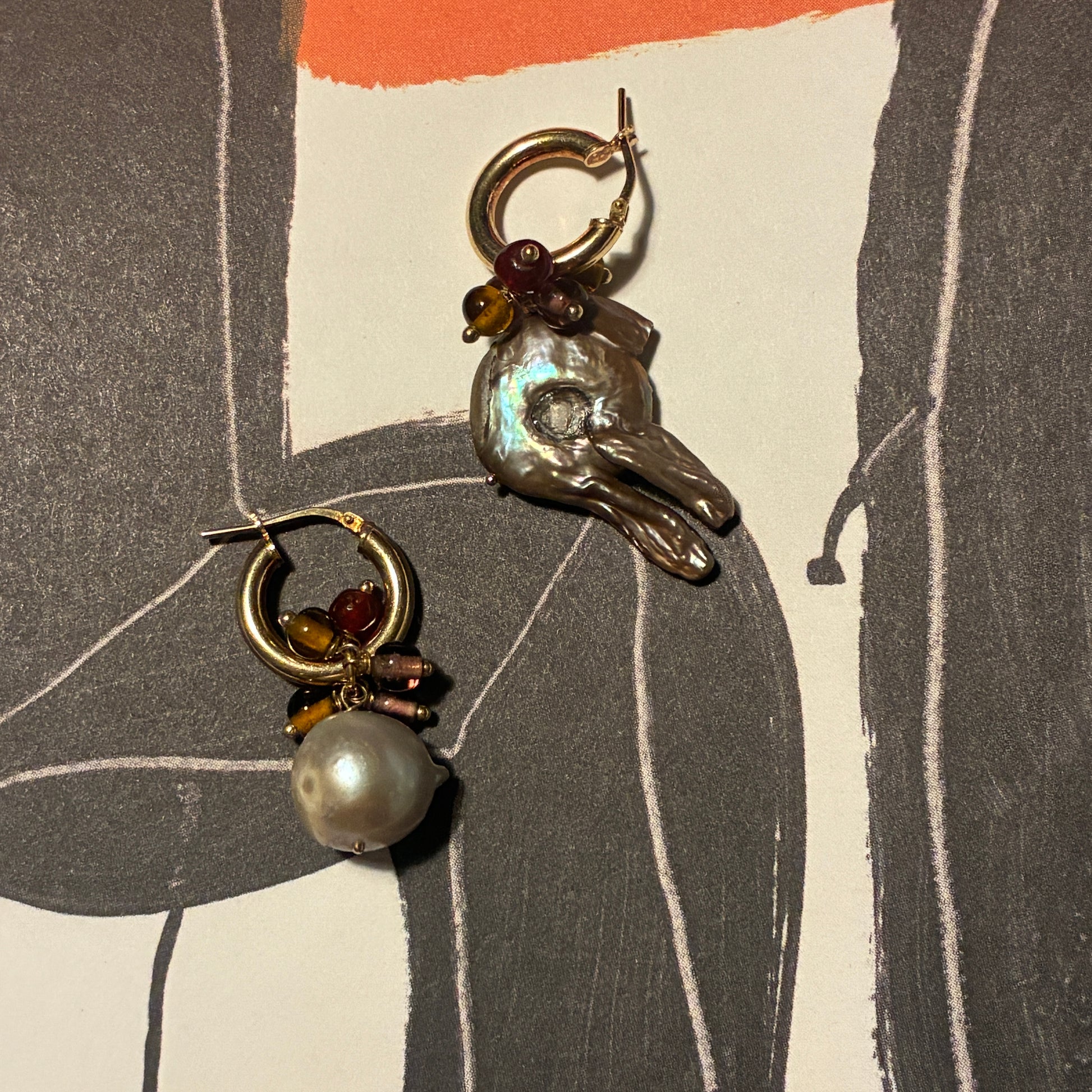 Orecchini a cerchio con pendenti, realizzati a mano. La base è rodiata gialla, i ciondoli sono realizzati a mano con materiali di recupero (perle barocche e vetro”. Si tratta di pezzi unici. Non esporre ad agenti chimici o acqua.