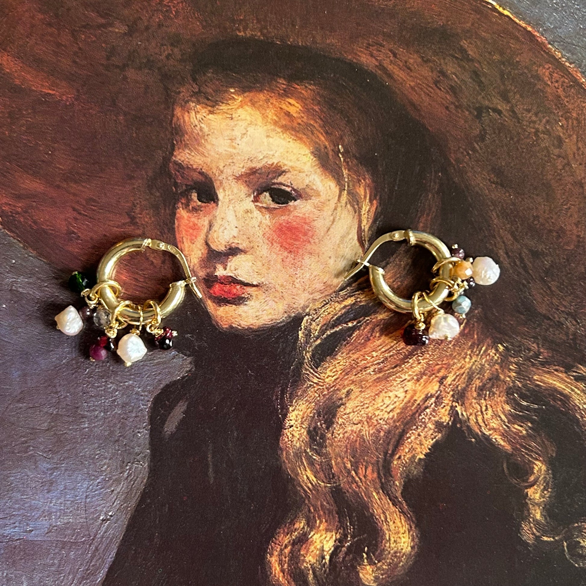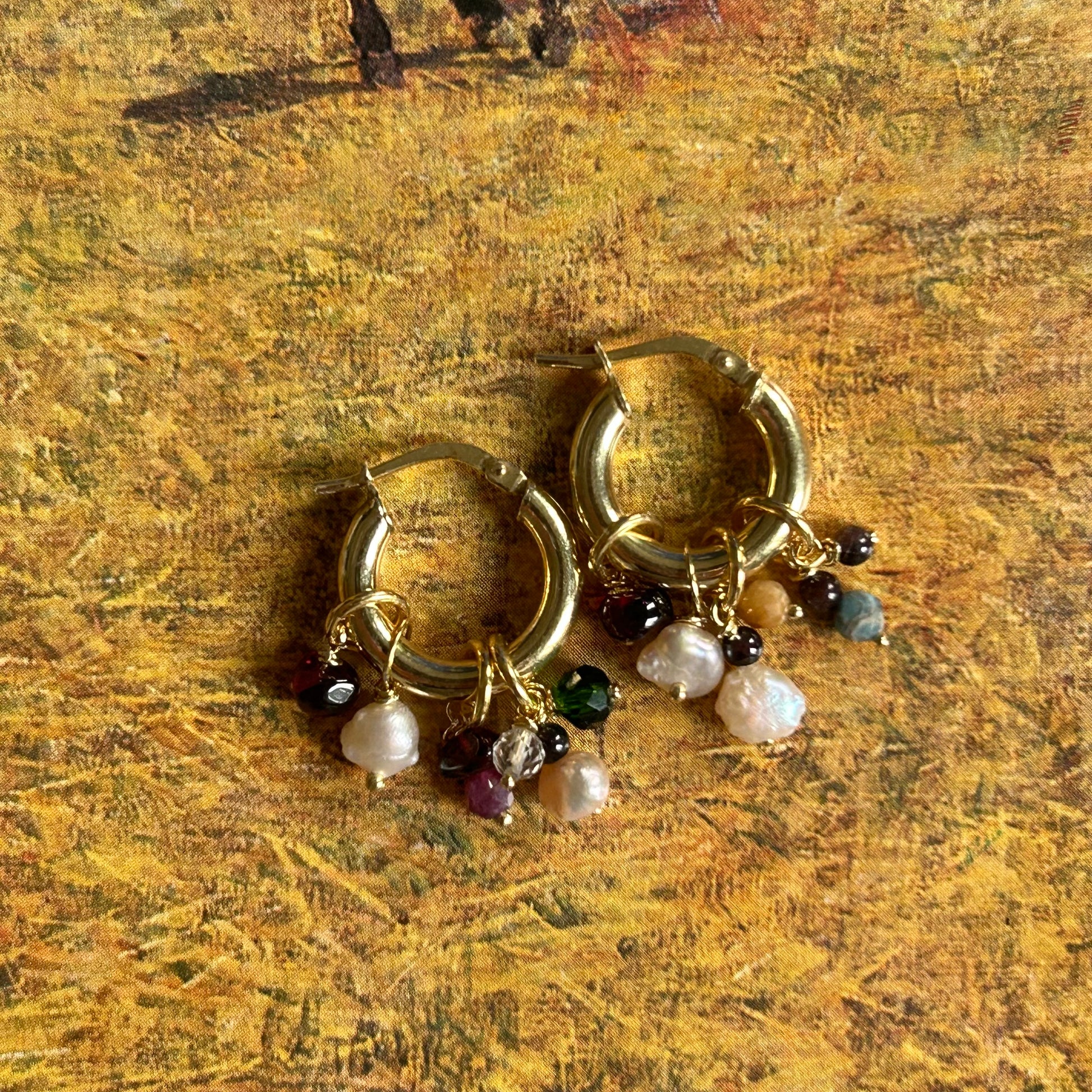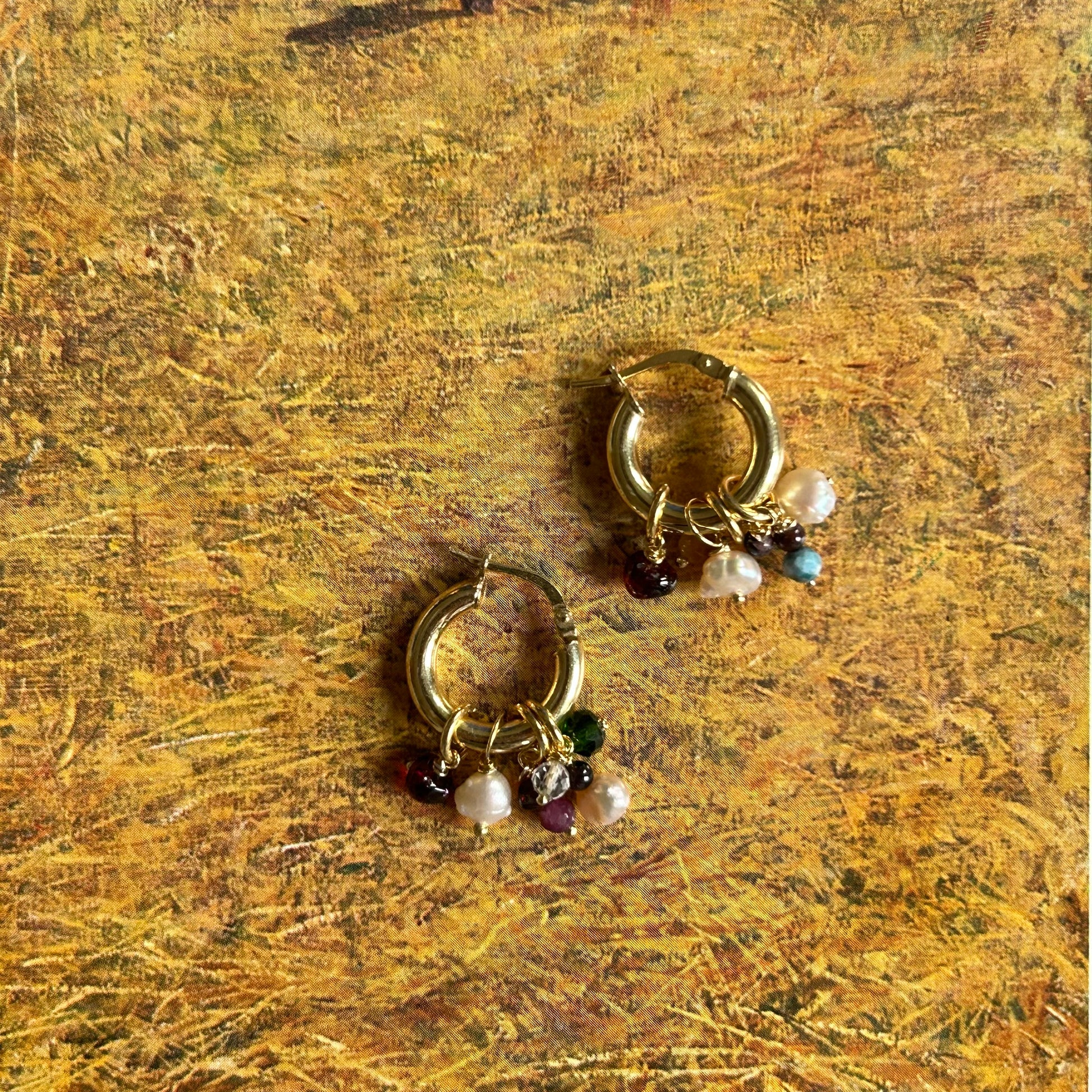 Orecchini a cerchio con pendenti realizzati a mano. La base è in argento 925 rodiata gialla, i ciondoli sono realizzati con materiali di recupero. Si tratta di pezzi unici. Non vanno esposti ad agenti chimici o acqua.