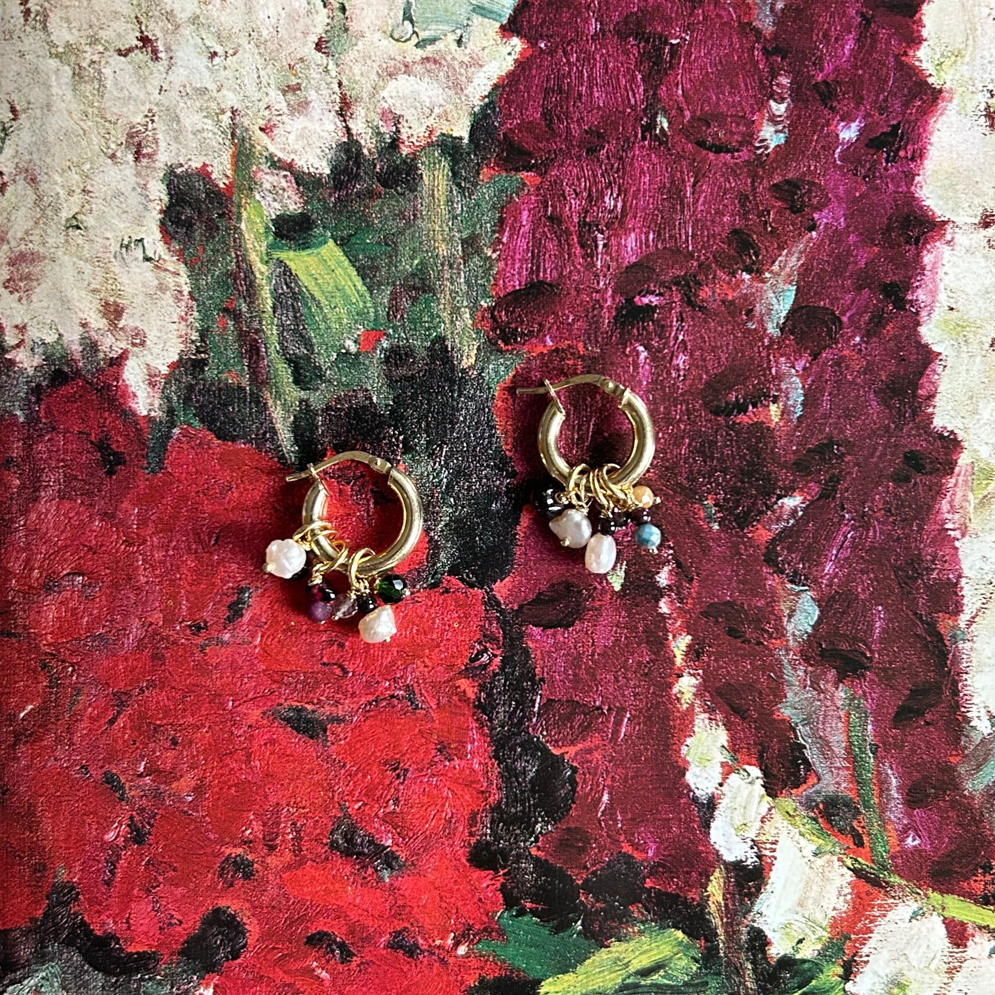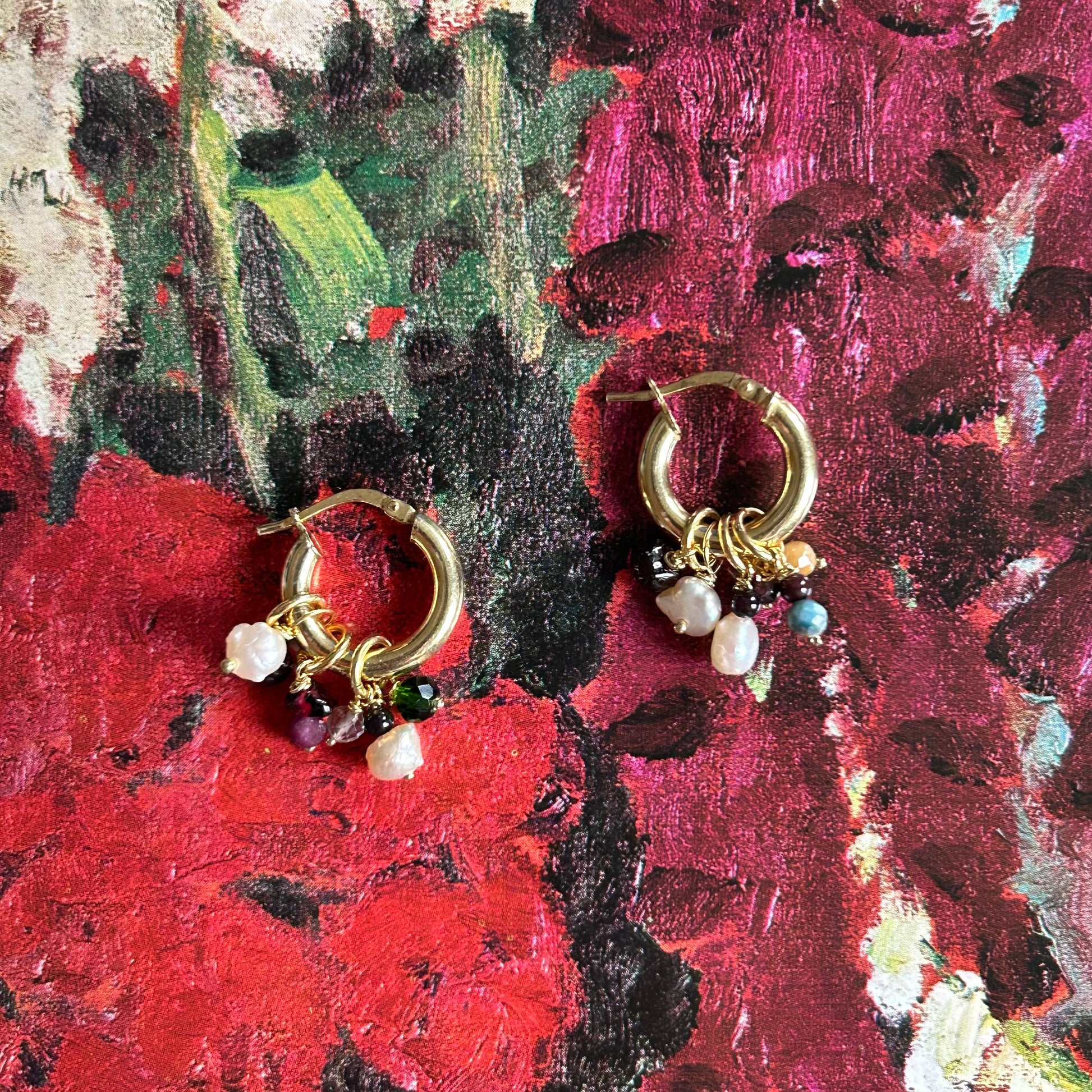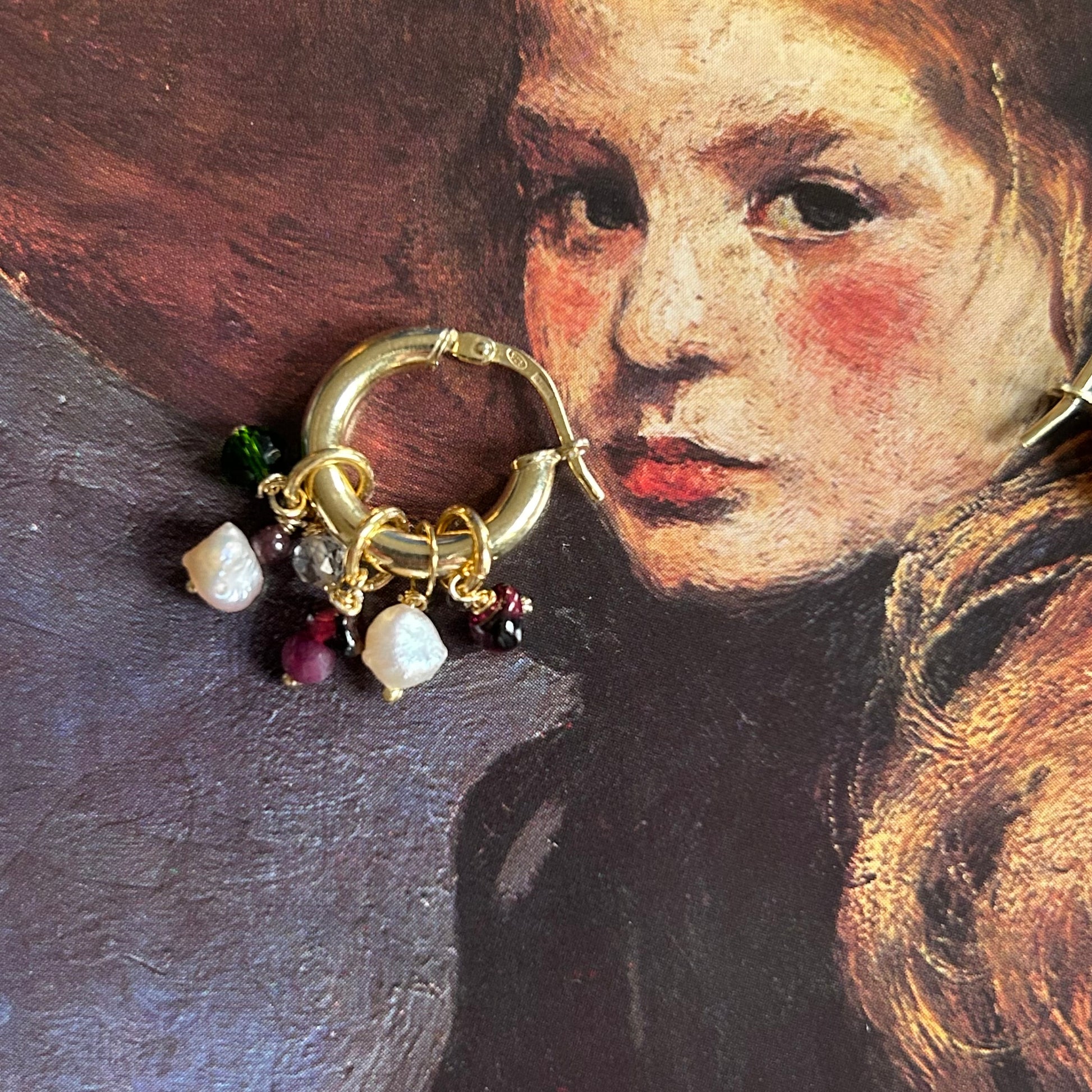 Orecchini a cerchio con pendenti realizzati a mano. La base è in argento 925 rodiata gialla, i ciondoli sono realizzati con materiali di recupero. Si tratta di pezzi unici. Non vanno esposti ad agenti chimici o acqua.