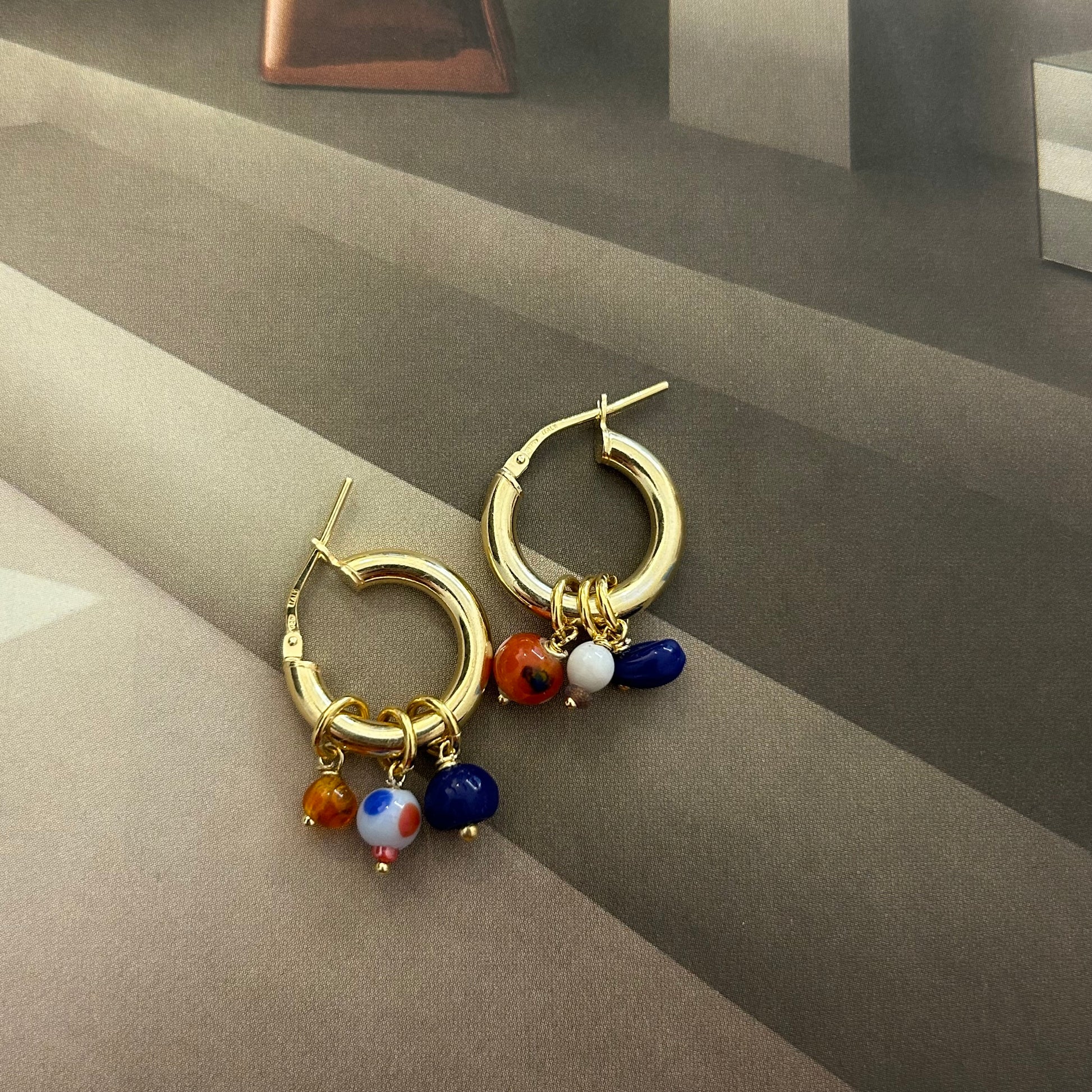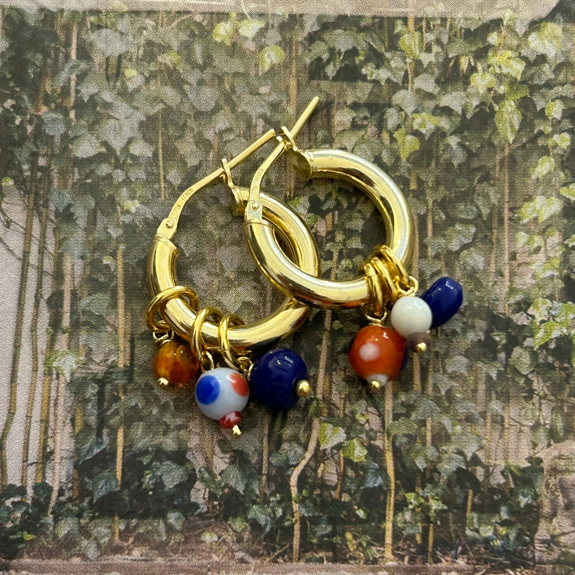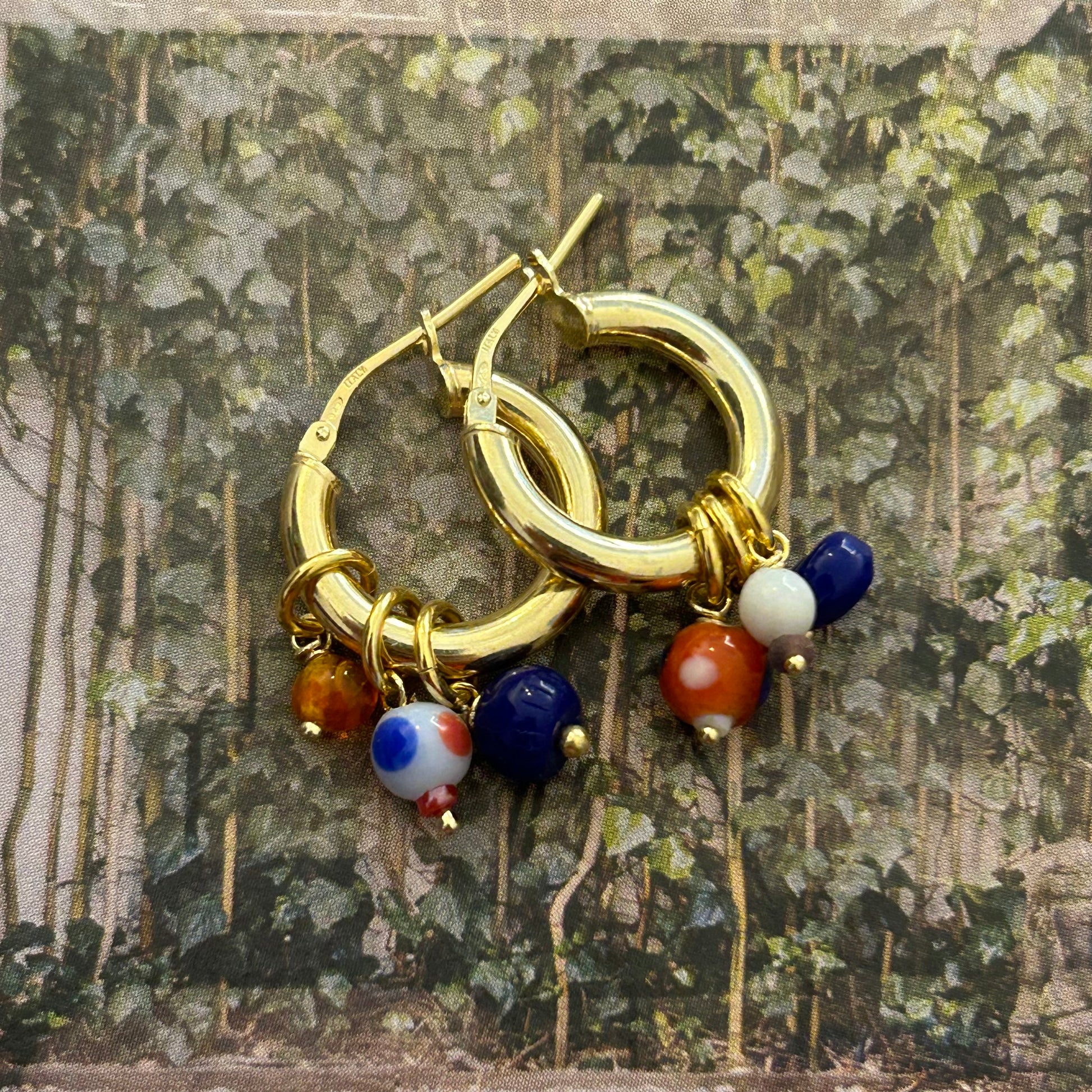 Orecchini a cerchio con pendenti, realizzati a mano. La base è rodiata gialla, i ciondoli sono realizzati a mano con materiali di recupero (pasta di vetro e pietre). Si tratta di pezzi unici. Non esporre ad agenti chimici o acqua.