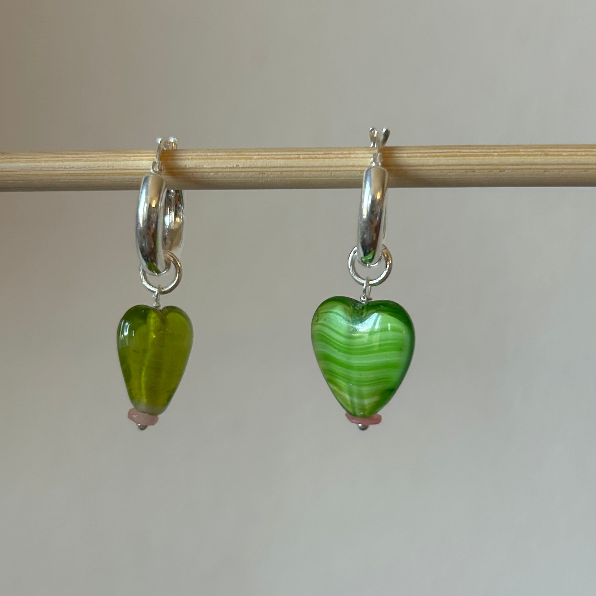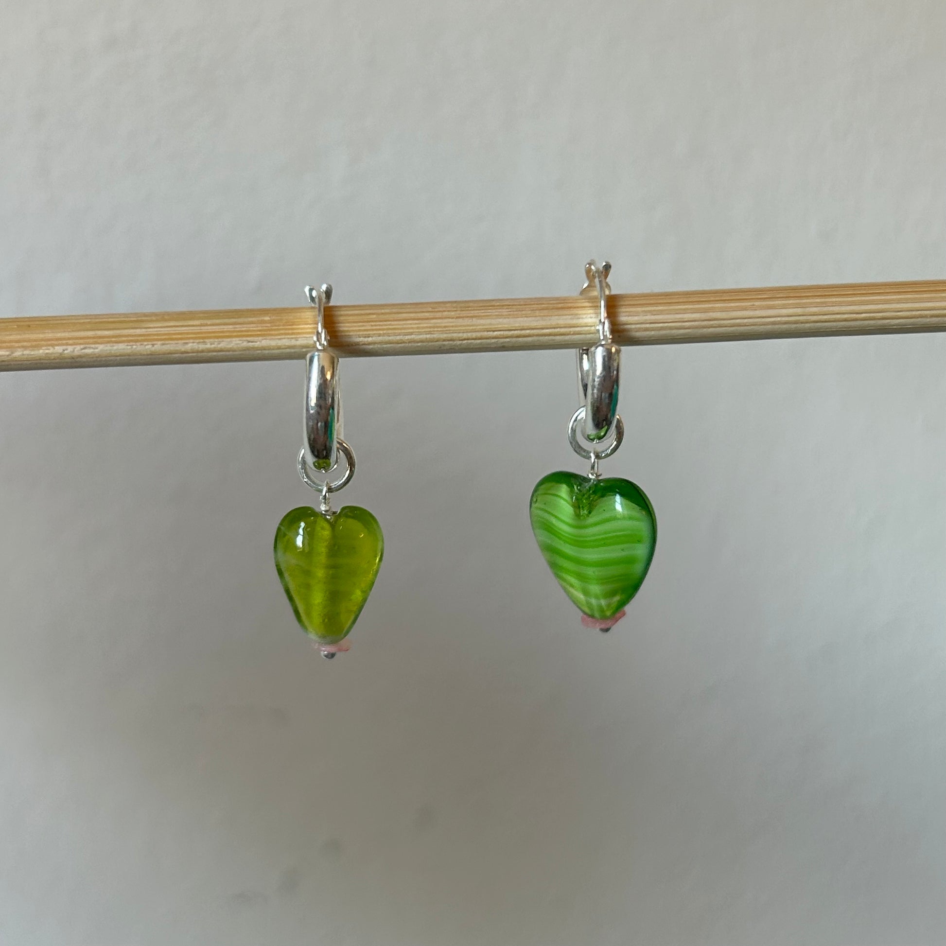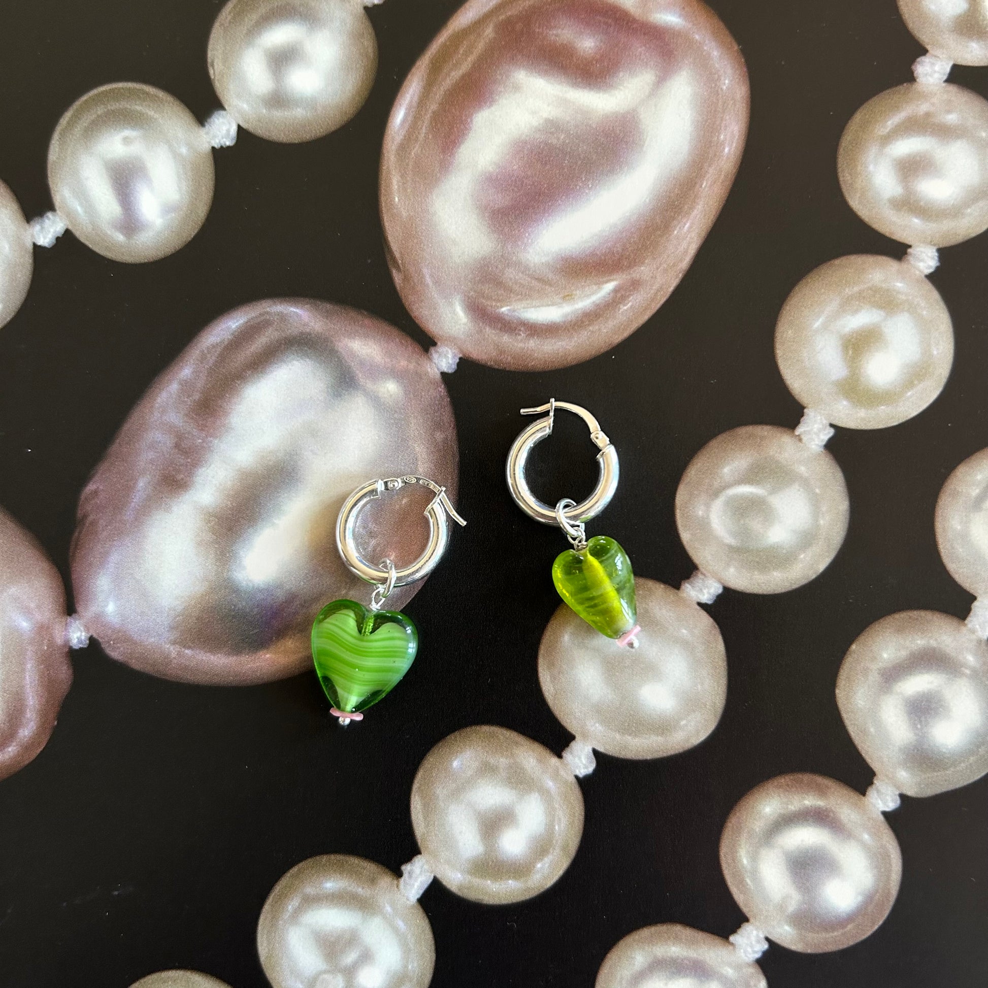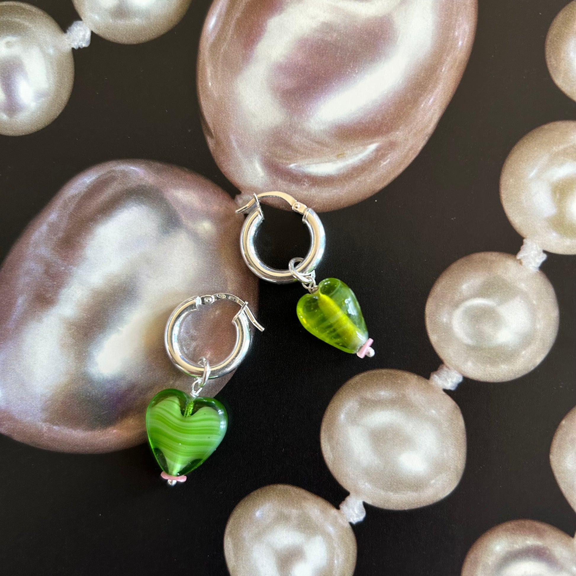 Orecchini a cerchio con pendenti realizzati a mano. La base è in argento 925, i ciondoli sono realizzati a mano con materiali di recupero: pasta di vetro, resina e pietra. Si tratta di pezzi unici.