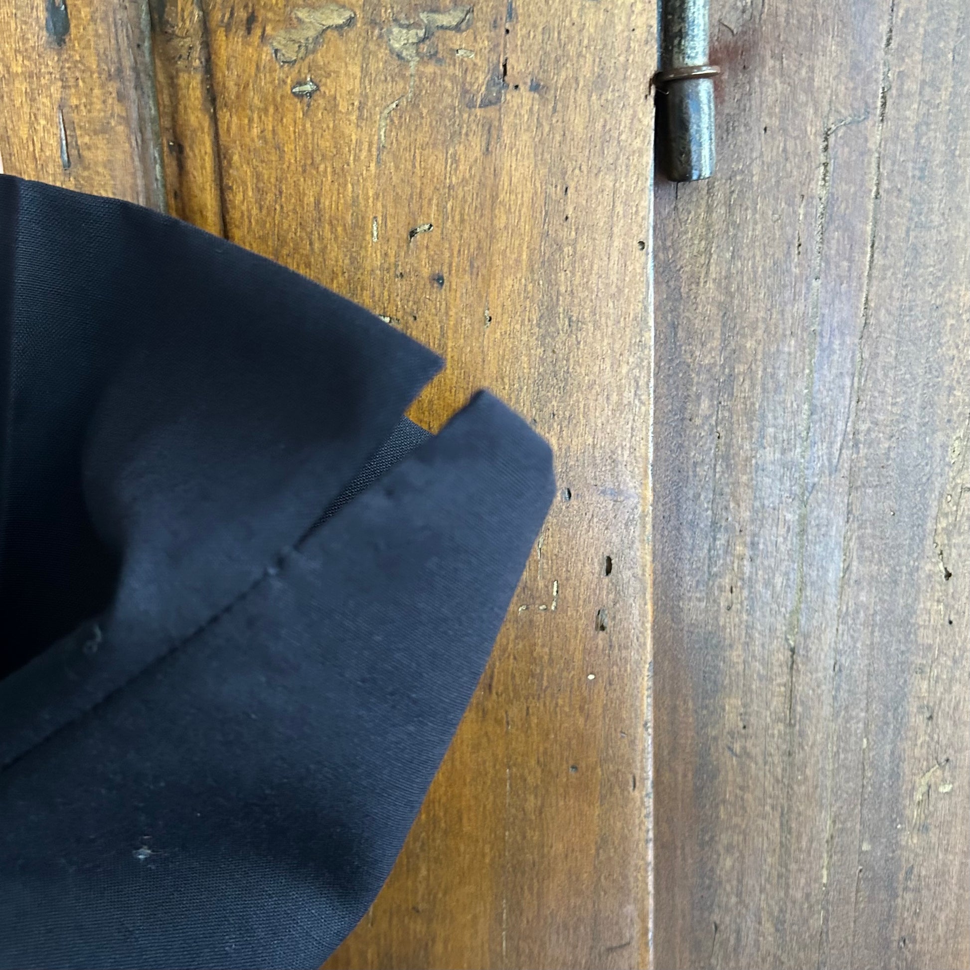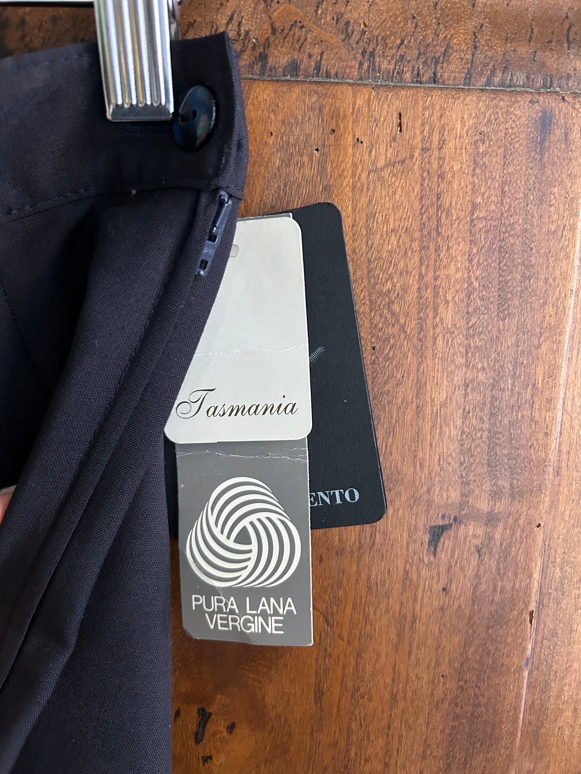 Pantaloni blu in pura lana vergine. Materiale sottile, si tratta di uno stock vintage quindi non sono mai stati utilizzati e presentano cartellino originale. Hanno dei piccoli spacchi a fine gamba zona caviglia (visibile in foto). Taglia 48 ma vestono leggermente più piccoli, si consiglia di controllare le misure.
